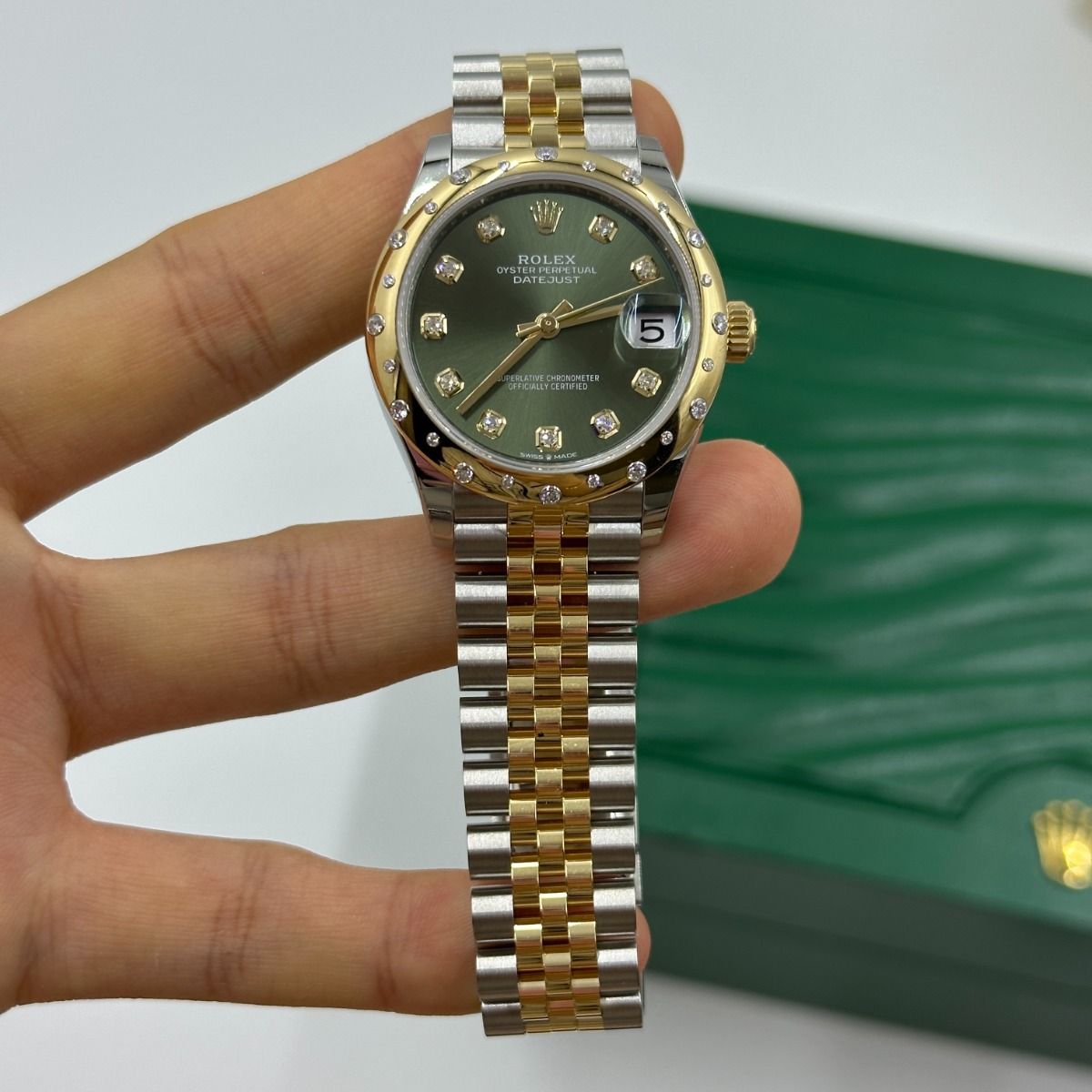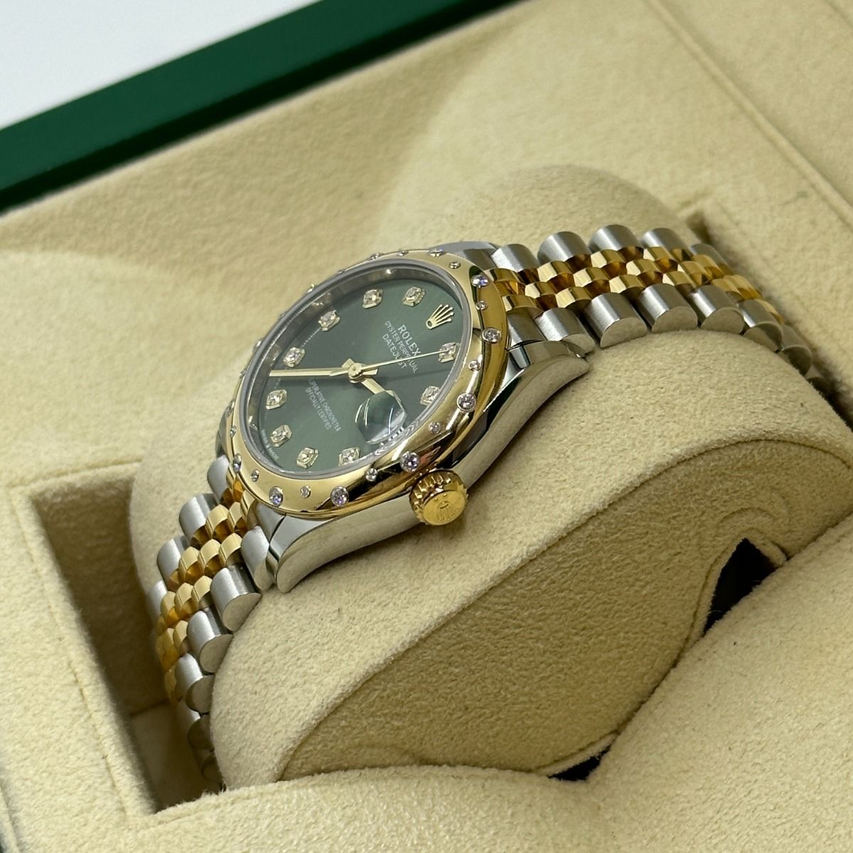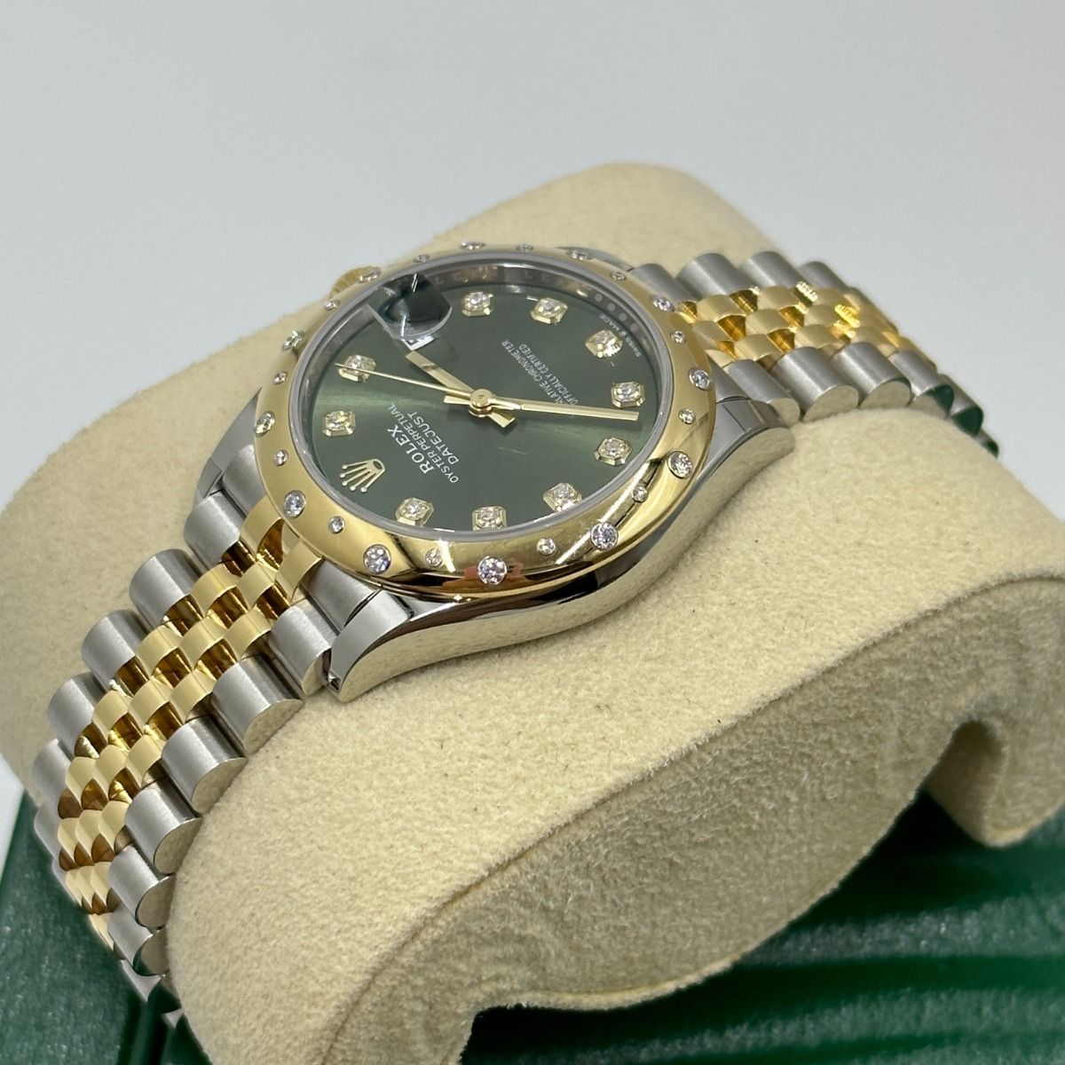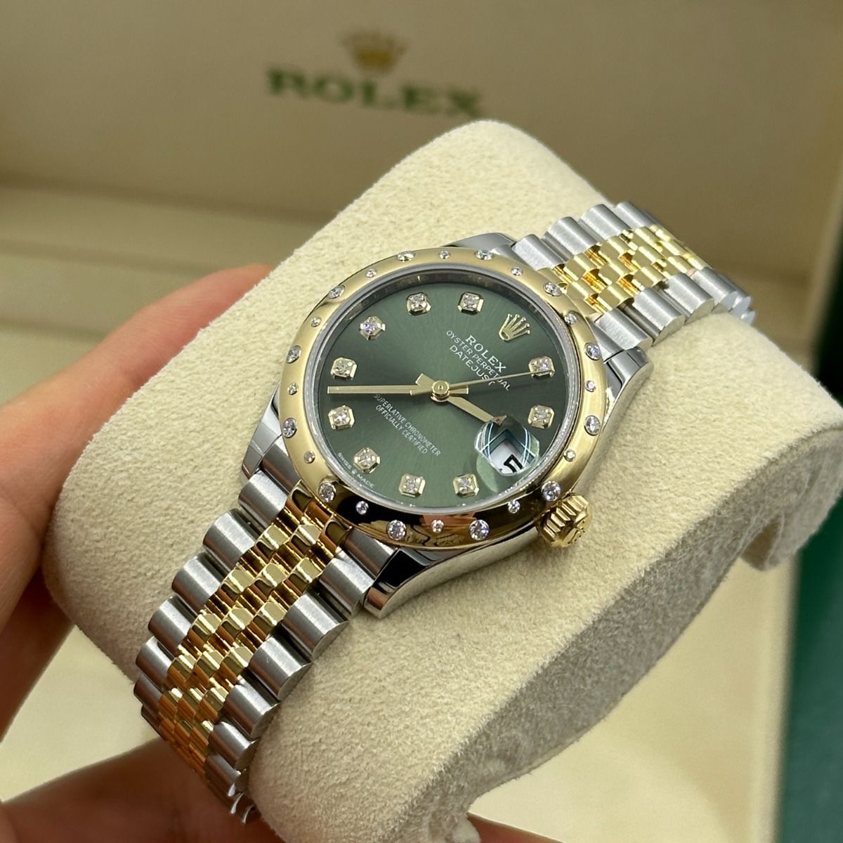 | Dial Color | Olive green set with diamonds |