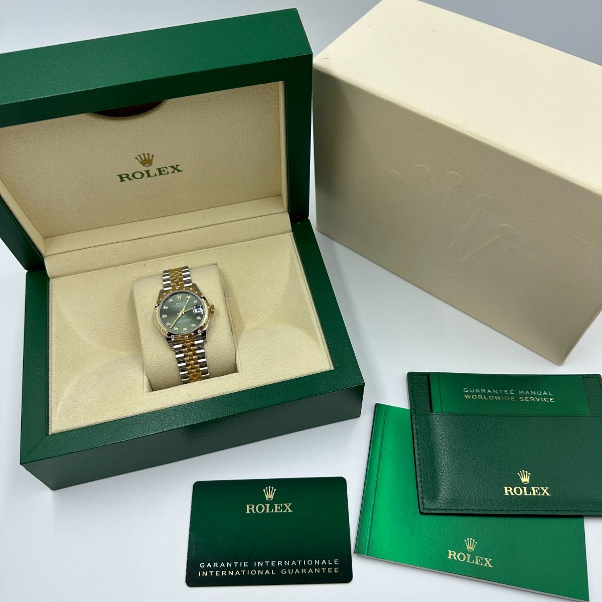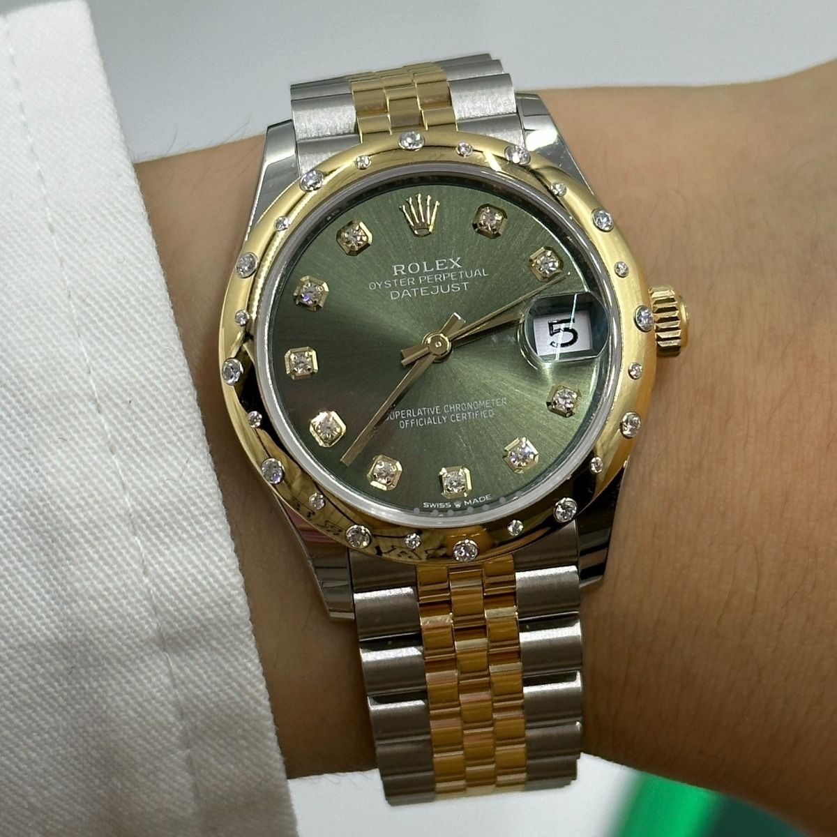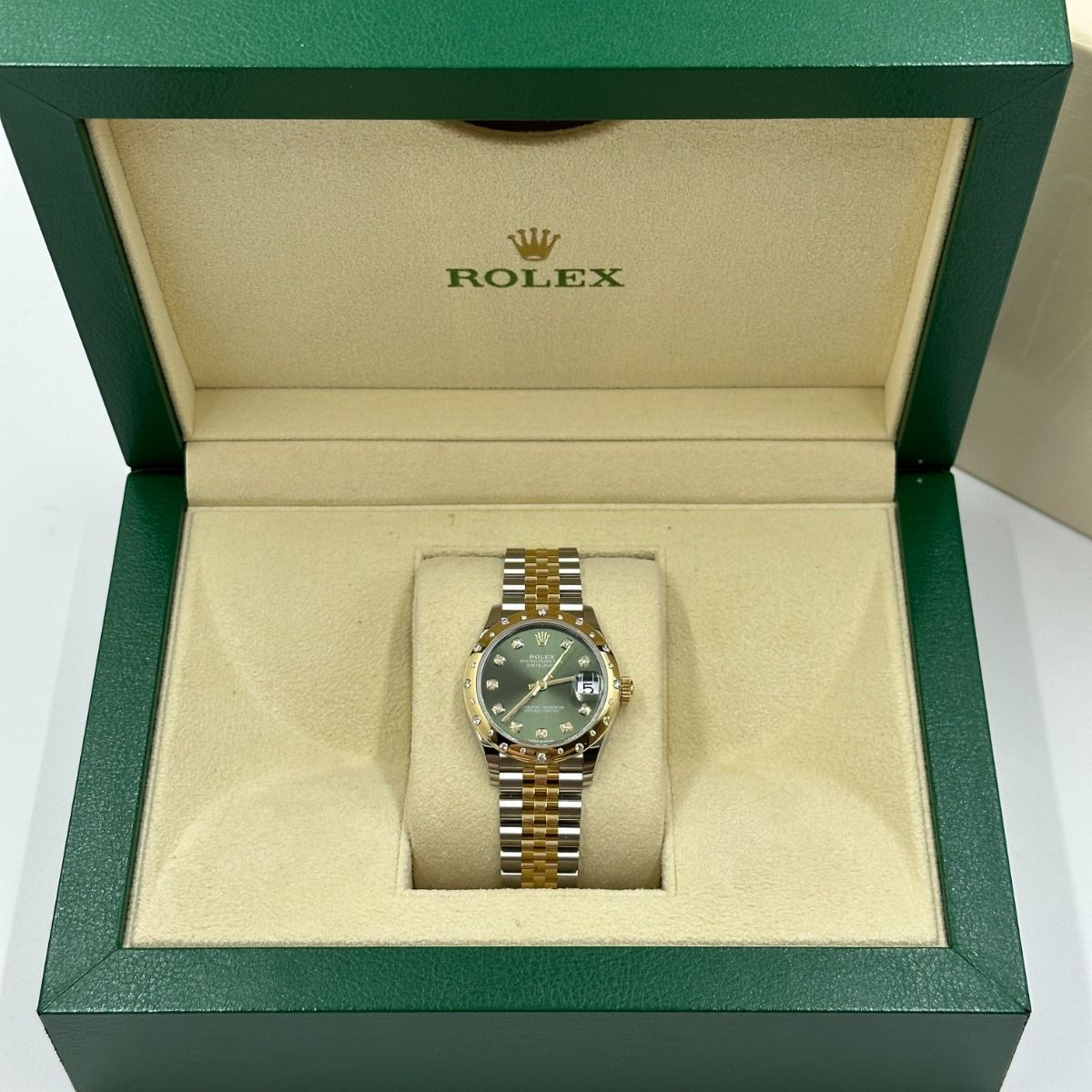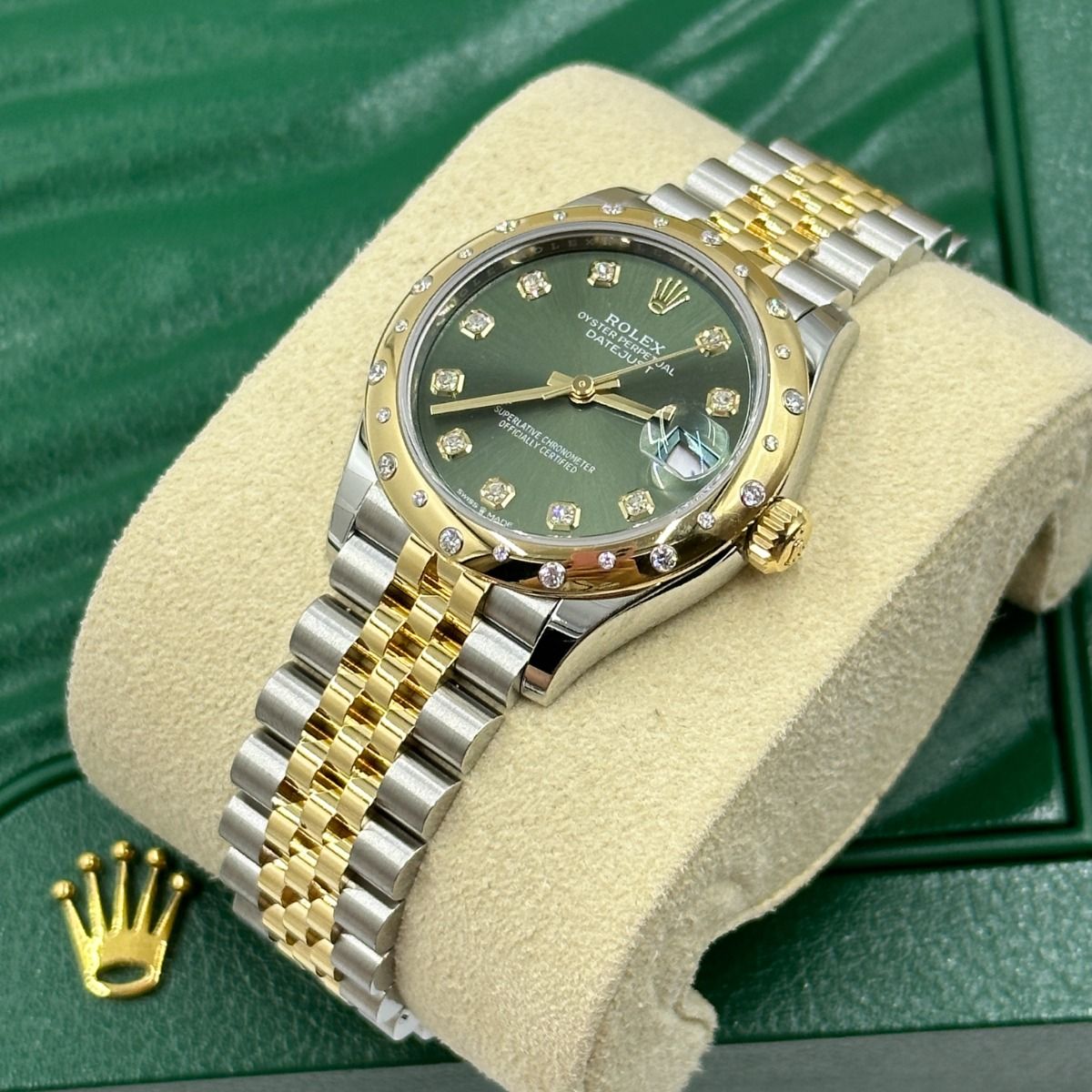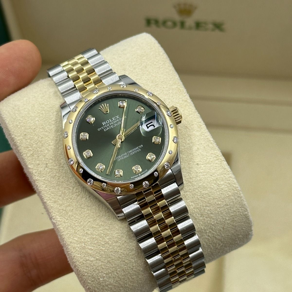 | Dial Color | Olive green set with diamonds |