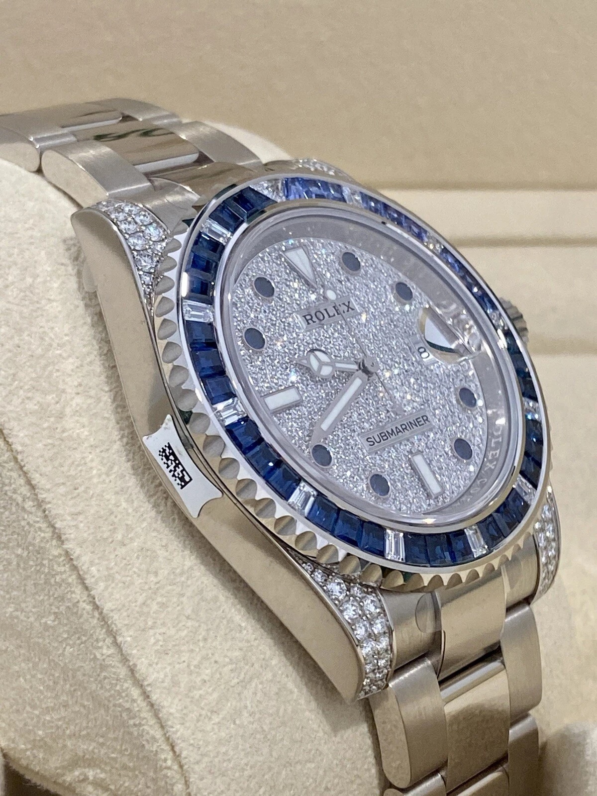 Rolex Submariner Automatic Chronometer Saphire Set Diamond Watch 116659SABRO18kt white gold case with a silver-tone 18kt white gold bracelet, Blue diamond set bezel. Pave dial with index hour markers, Minute markersaround the outer rim. Dial Type: Analog. Luminescent hands and markers. Date display at the 3 o'clock position, Rolex Calibre 3135 Automatitmovement, containing 31 jewels, bitting at 28800 vph, and has a power reserve of approximately 48 hours, Sratch resistant sapphire crystalScrew down crown, Solid case back, Round case shape, case size:40 mm, Ovsterlock clasp, Water resistant at 300 meters / 1000 feet Functionsdate, hour, minute, second, chronometer. Submariner Series. Dive watch style. Watch label: Swiss Made. Rolex Submariner AutomaticChronometer Saphire Set Diamond Watch 116659SABRO