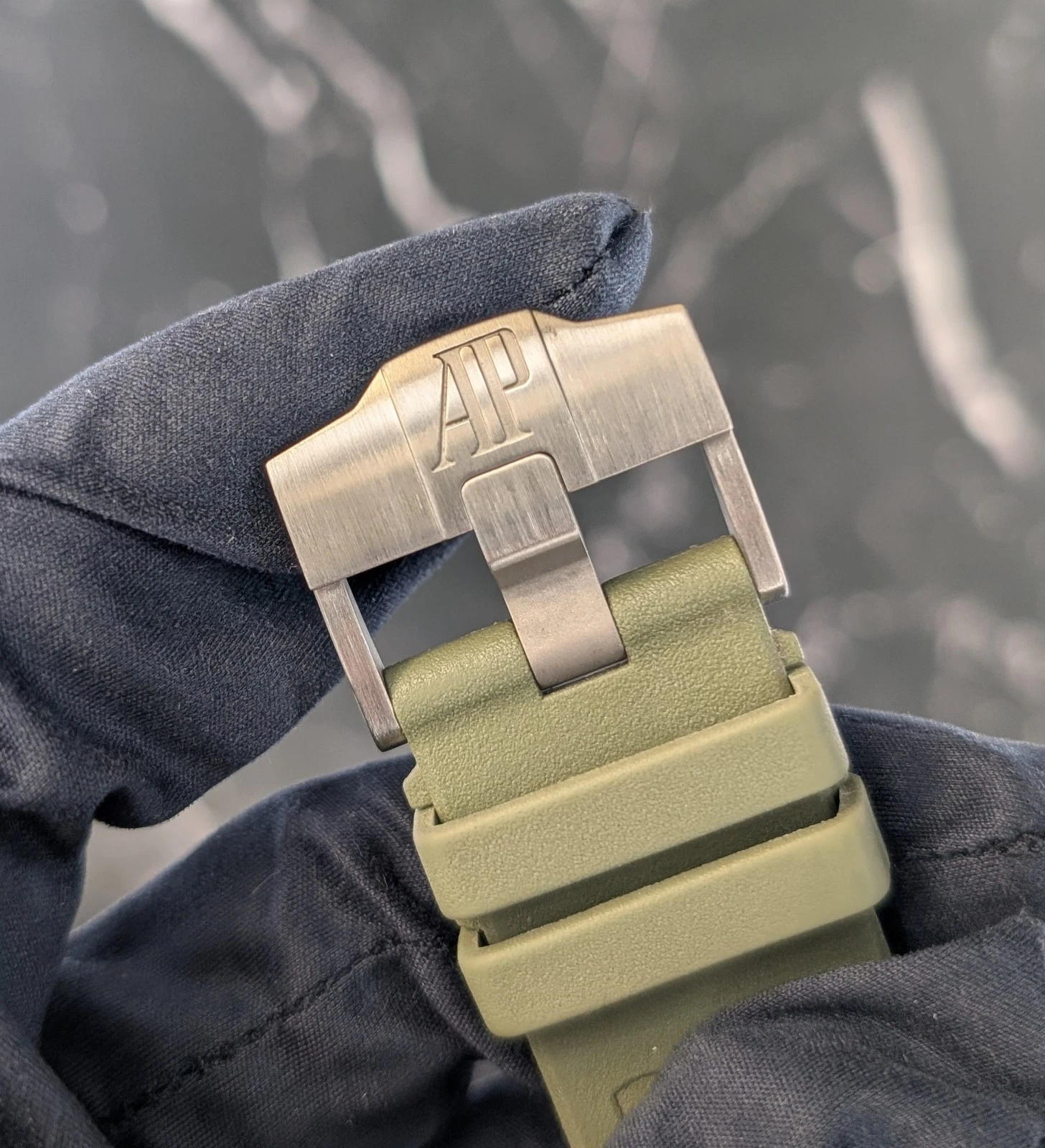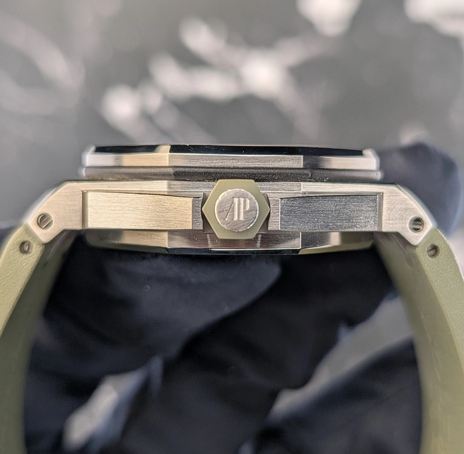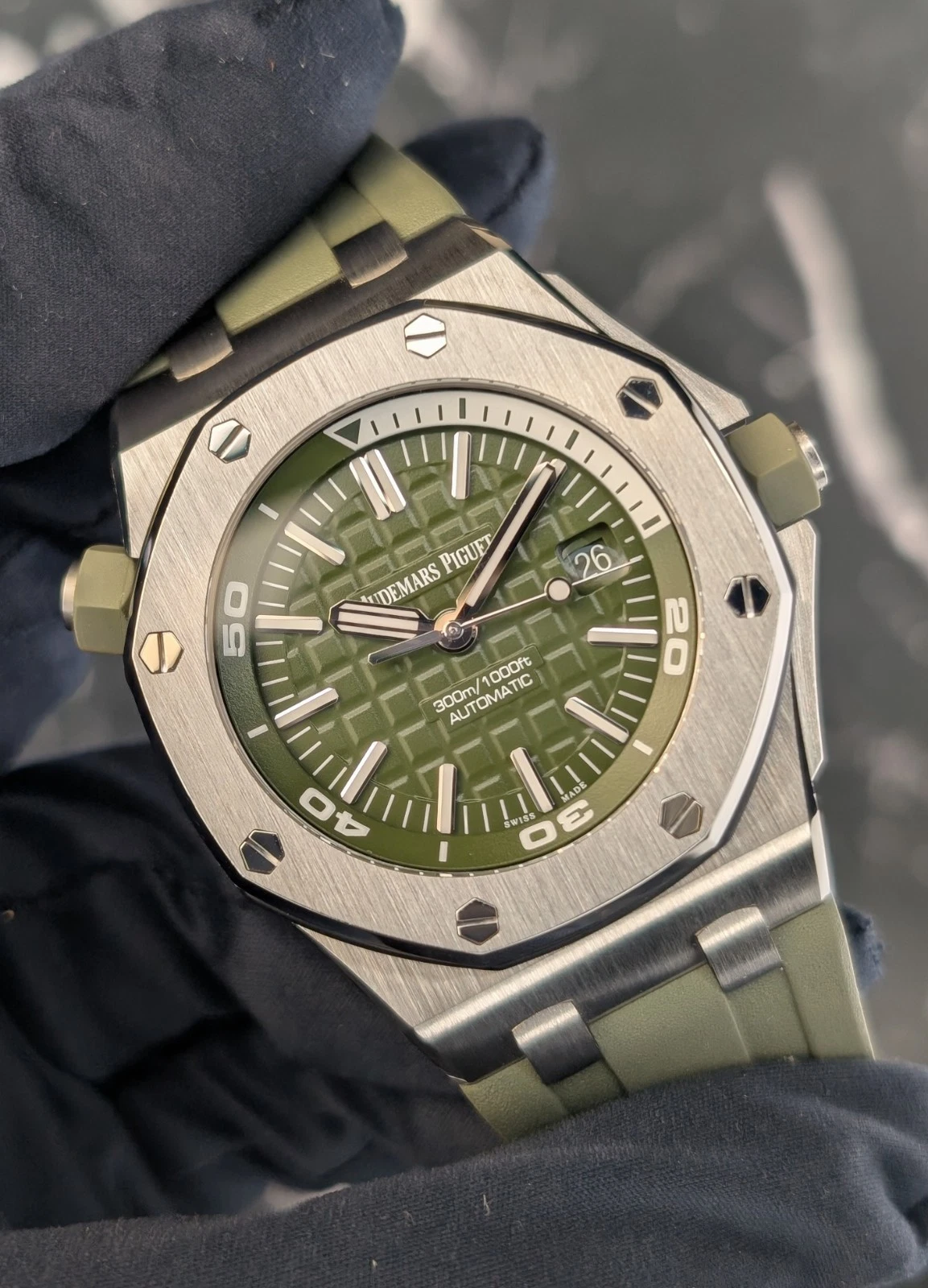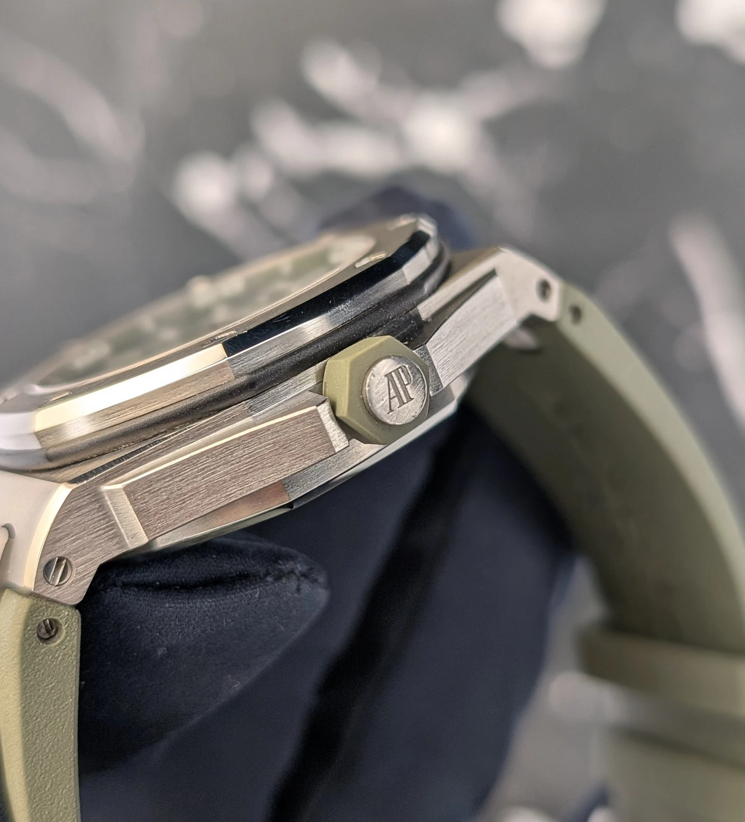 Khaki dial with “Méga Tapisserie” pattern, white gold applied hour-markers and Royal Oak hands with luminescent coating, khaki rotating inner bezel with zone from 60 to 15 minutes in white.