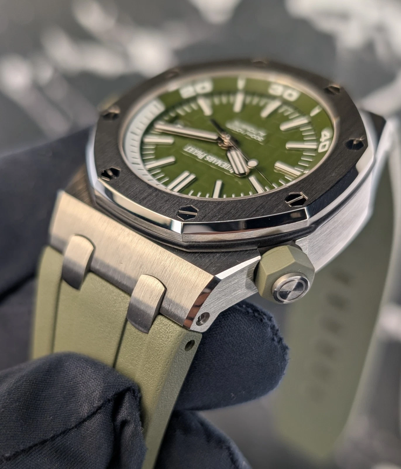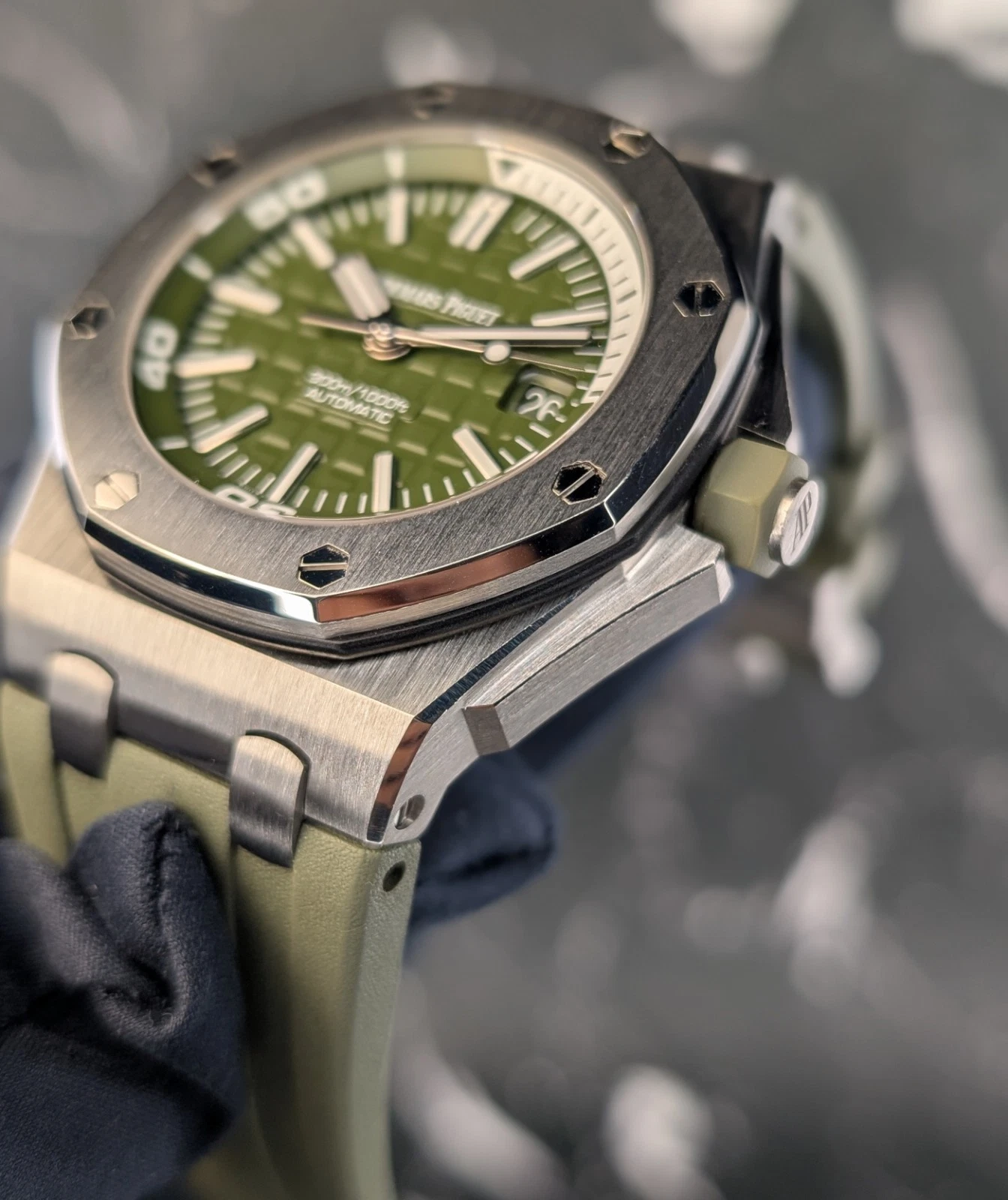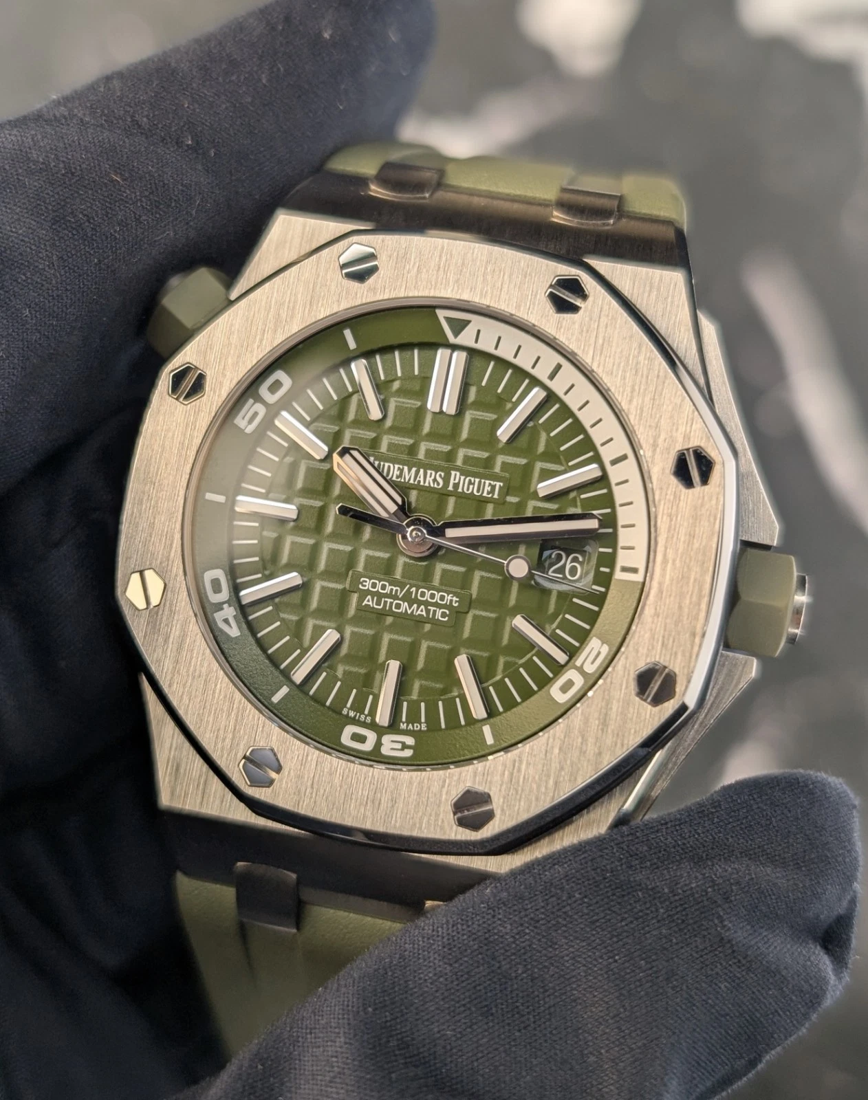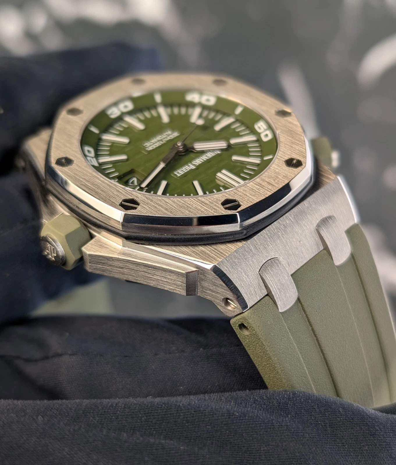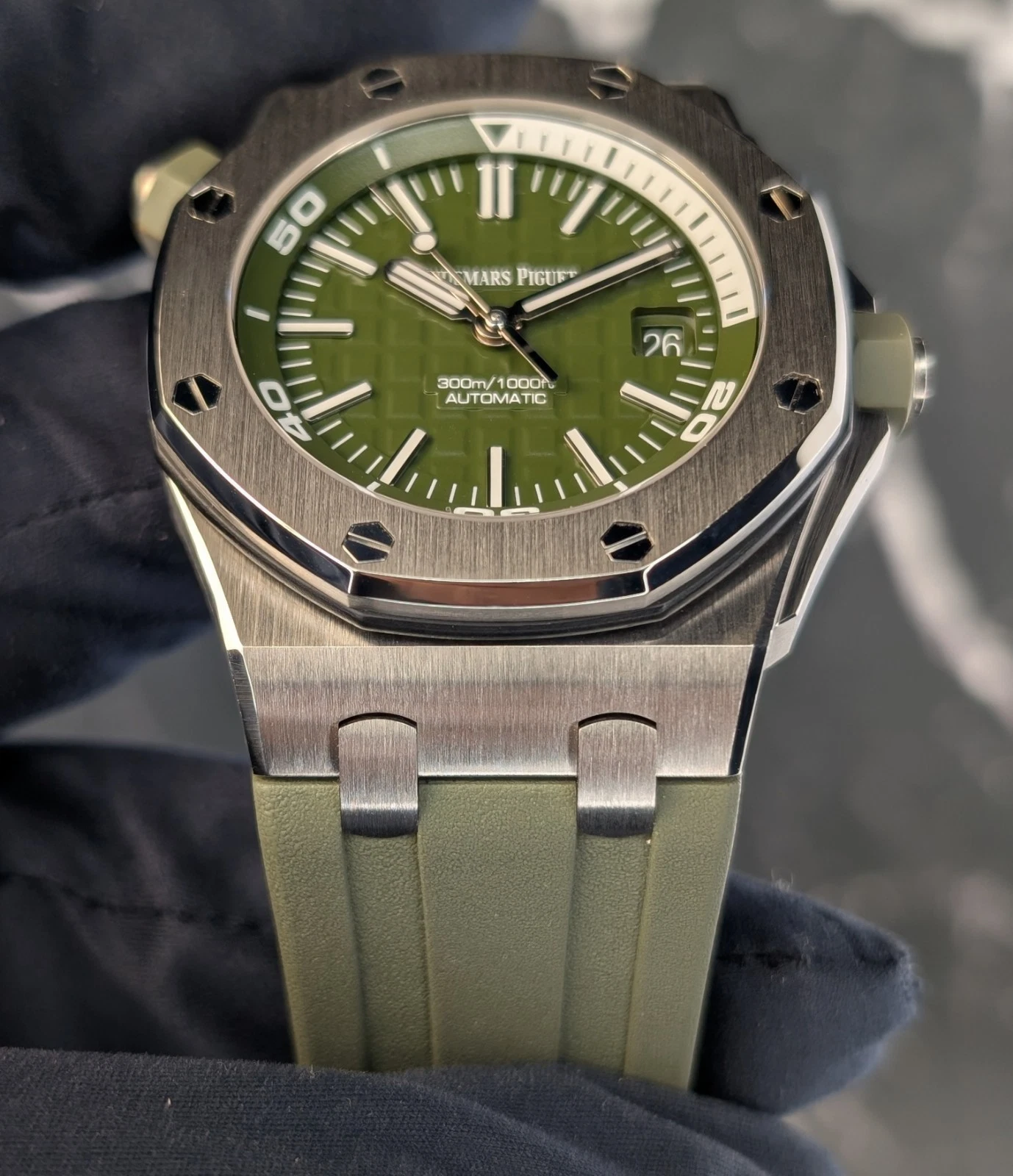 Khaki dial with “Méga Tapisserie” pattern, white gold applied hour-markers and Royal Oak hands with luminescent coating, khaki rotating inner bezel with zone from 60 to 15 minutes in white.