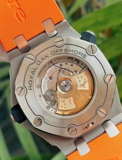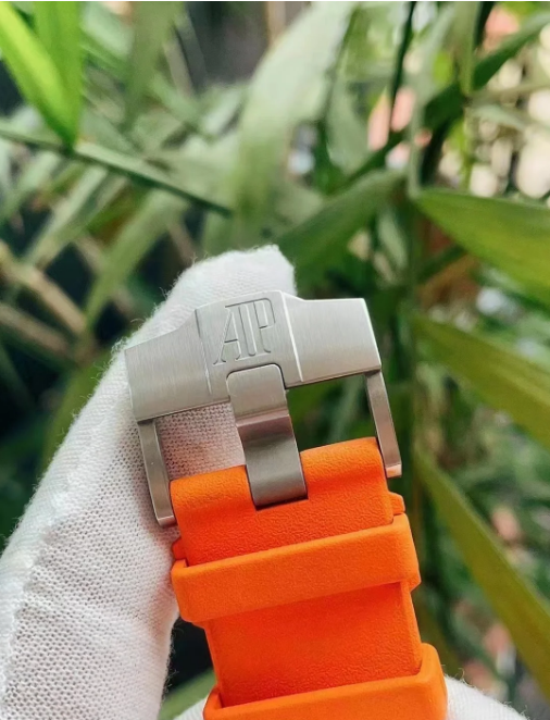 Orange dial with “Méga Tapisserie” pattern, white gold applied hour-markers and Royal Oak hands with luminescent coating, blue rotating inner bezel with diving scale and zone from 60 to 15 minutes in orange