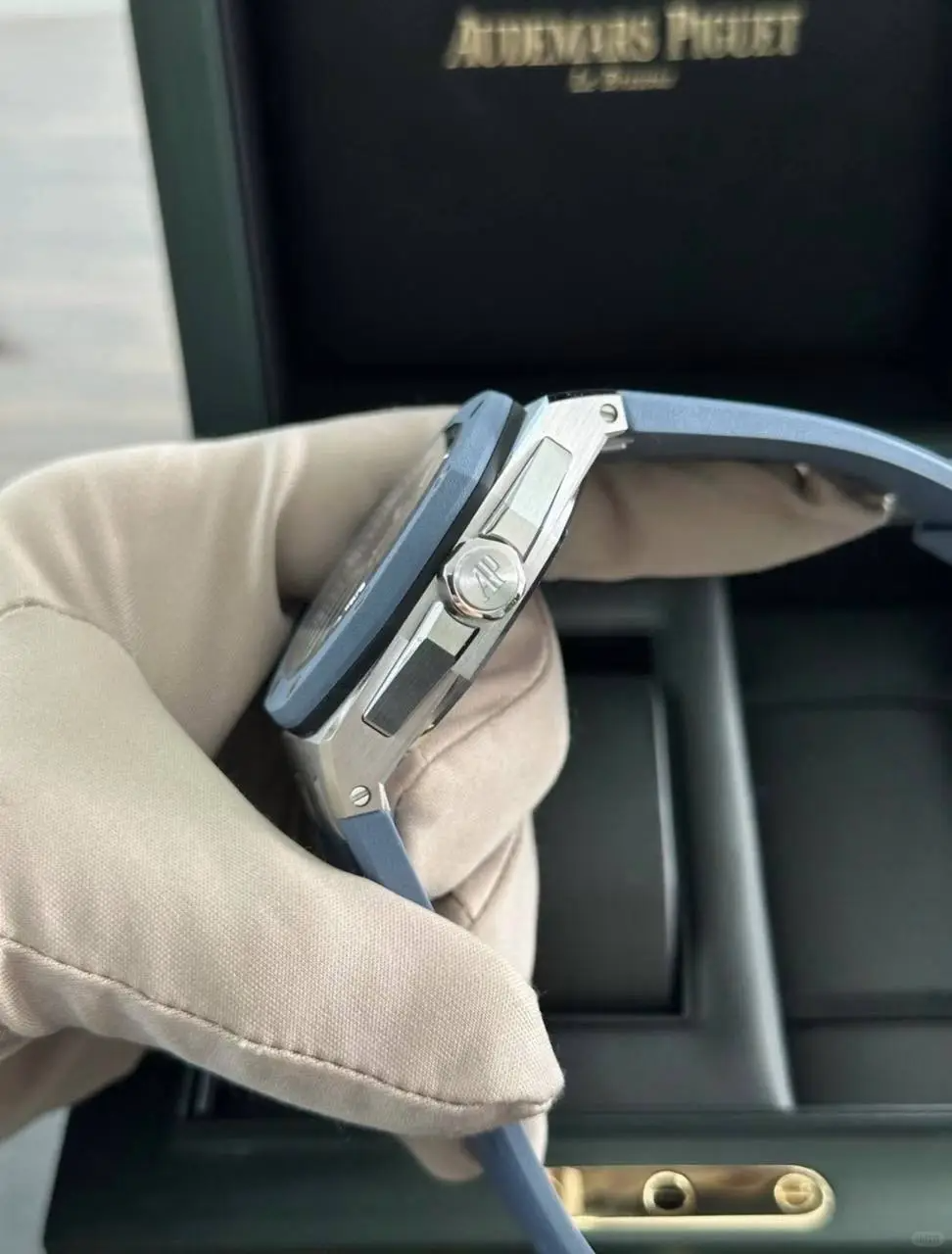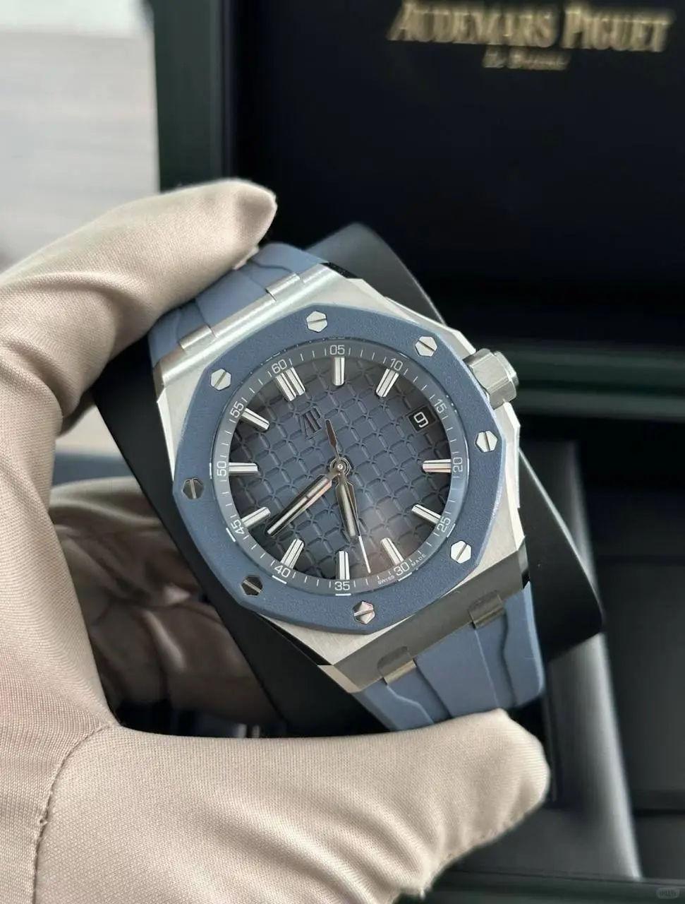 | Dial Material: | Smoked blue dial with “Méga Tapisserie” pattern, white gold hour-markers and Royal Oak hands with luminescent coating, blue inner bezel |