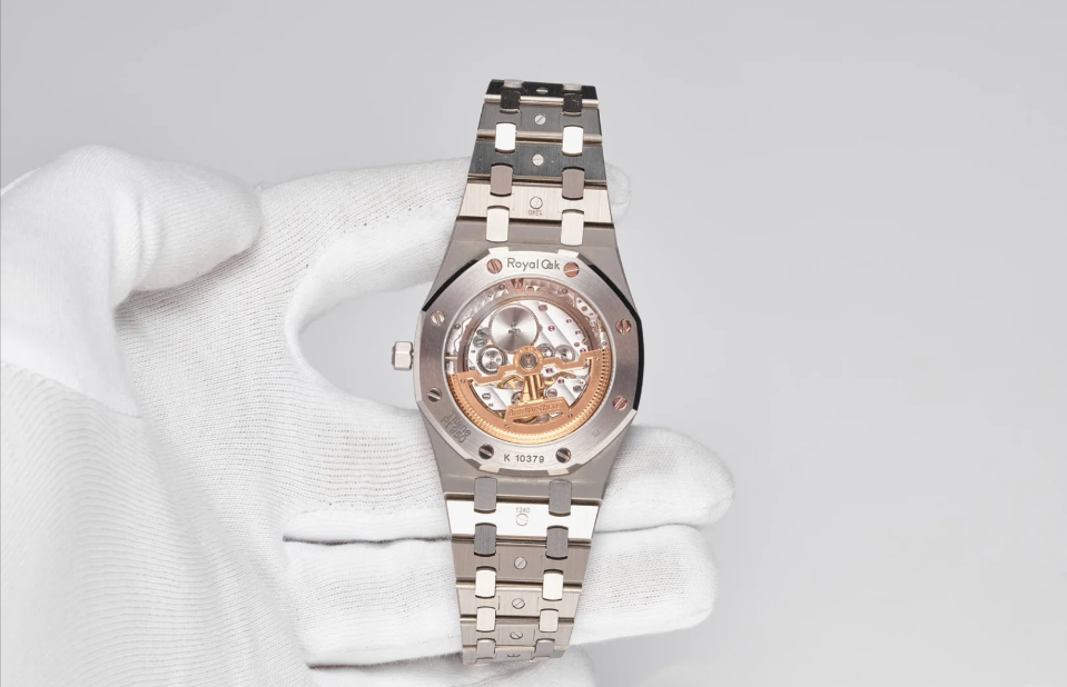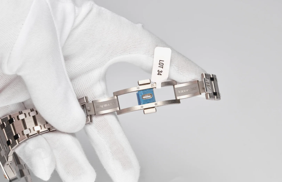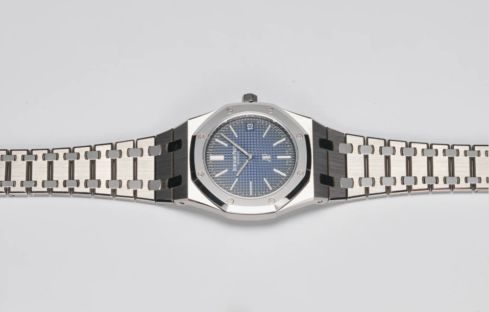 Smoked blue dial with “Petite Tapisserie” pattern, white gold applied hour-markers and Royal Oak hands with luminescent coating.