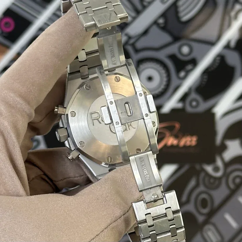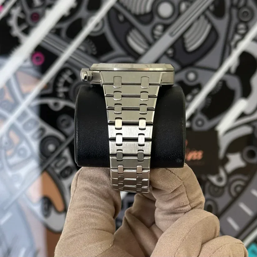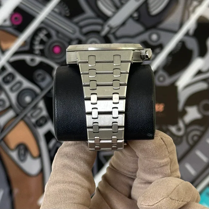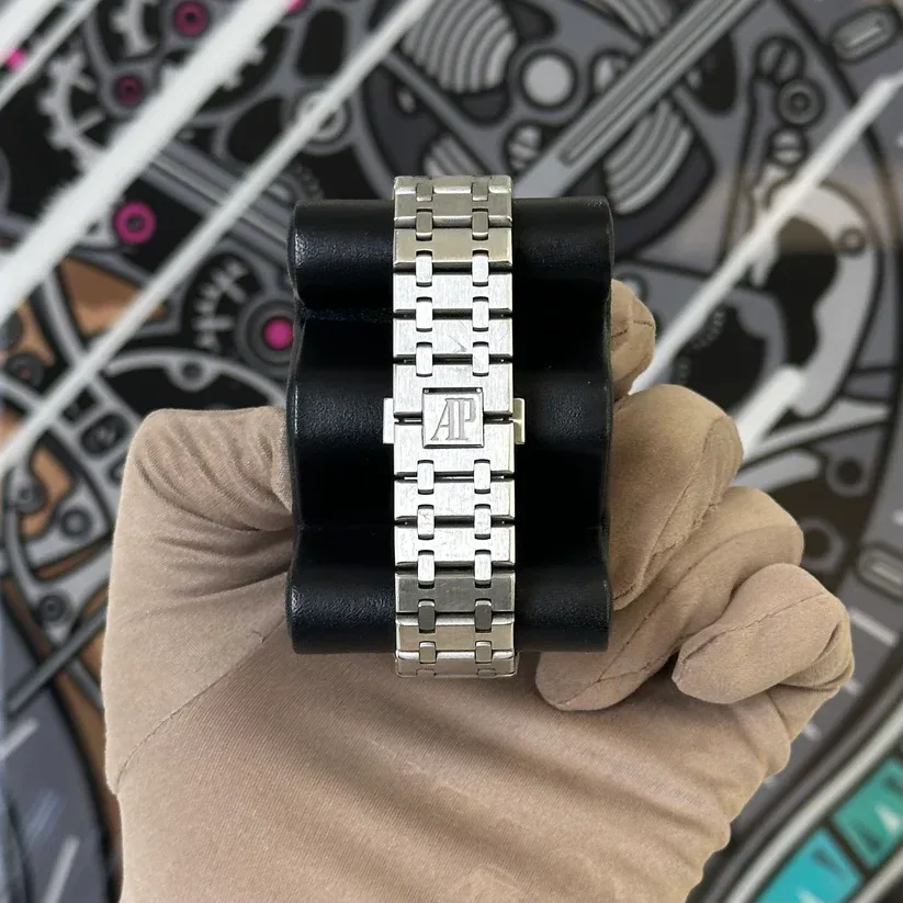 Blue dial with “Grande Tapisserie” pattern, rhodium-toned counters, white gold applied hour-markers and Royal Oak hands with luminescent coating.