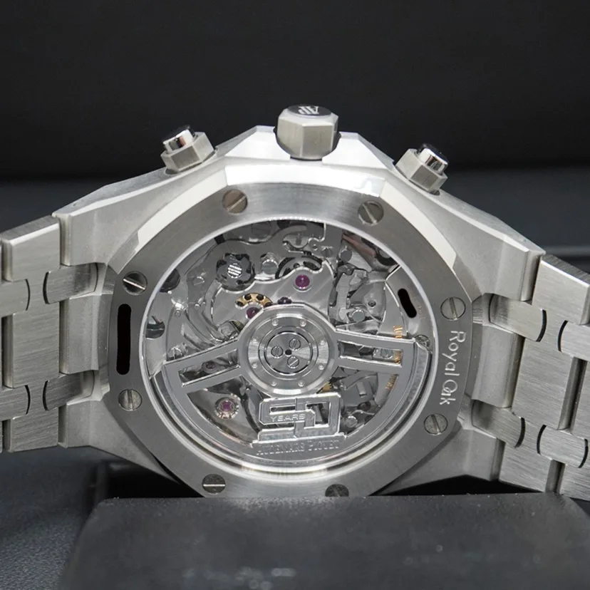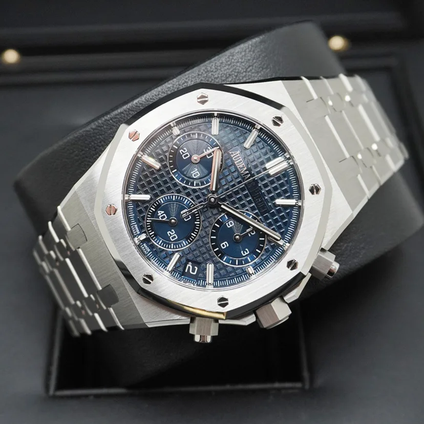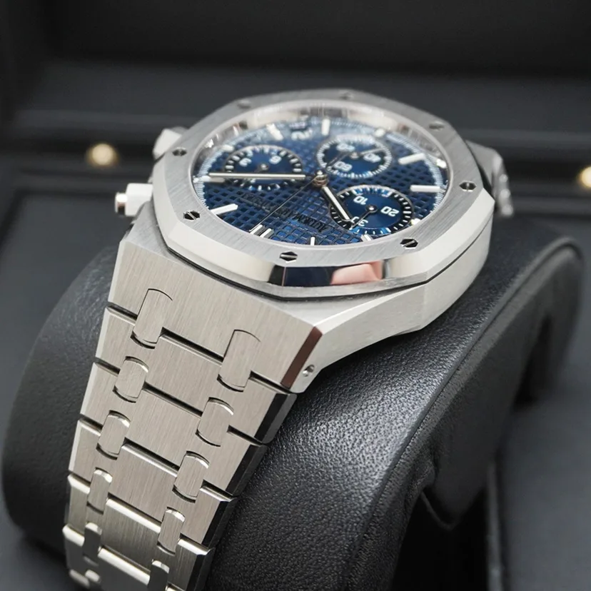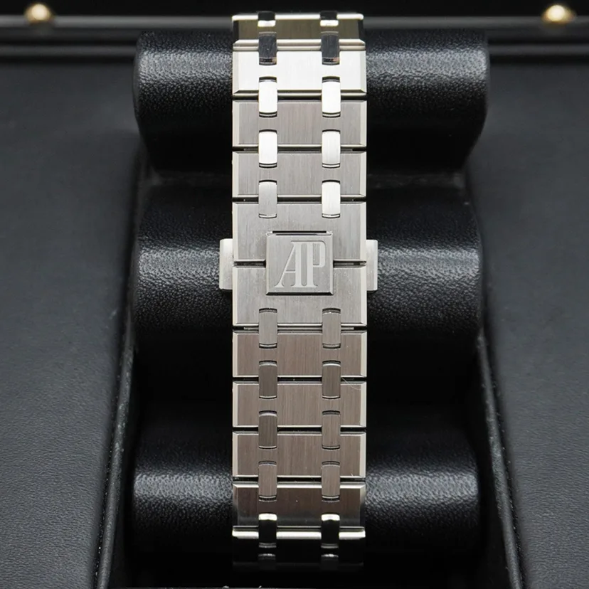 “Bleu nuit nuage 50” dial with “Grande Tapisserie” pattern, “Bleu nuit nuage 50” counters, white gold applied hour-markers and Royal Oak hands with luminescent coating.