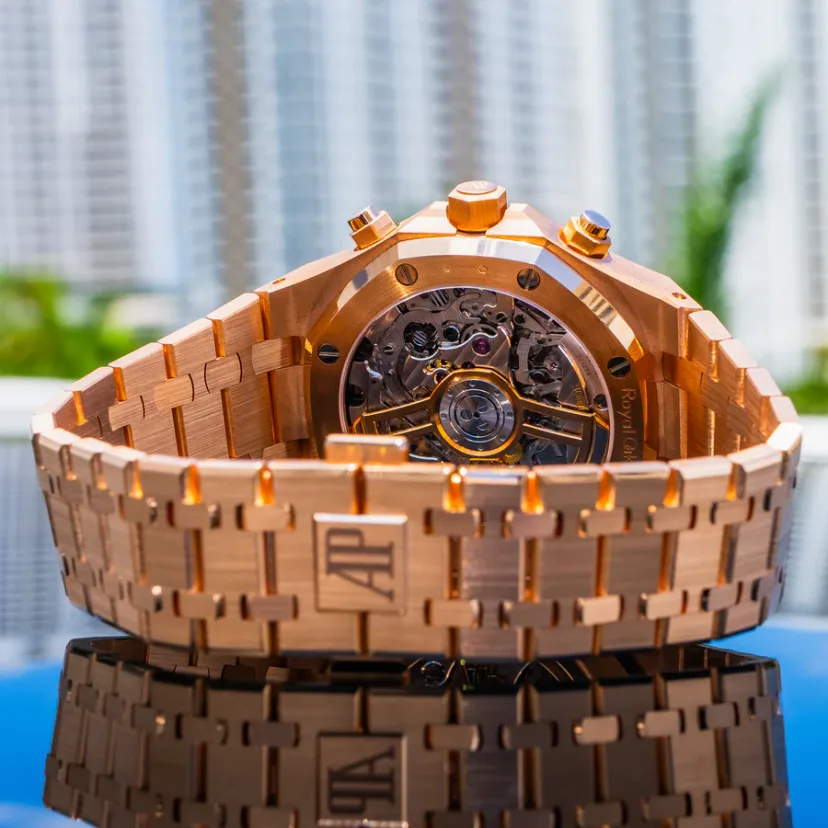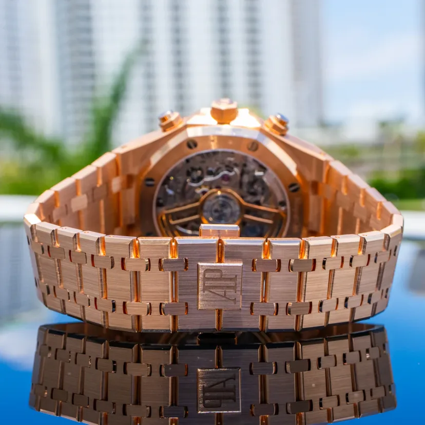 Khaki green dial with “Grande Tapisserie” pattern, khaki green counters, pink gold applied hour-markers and Royal Oak hands with luminescent coating.