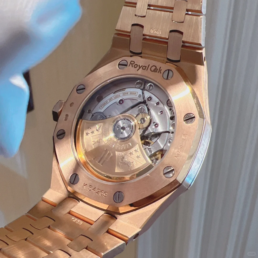 Dial Rose dial with “Grande Tapisserie” pattern, Rose gold applied hour-markers and Royal Oak hands with luminescent coating