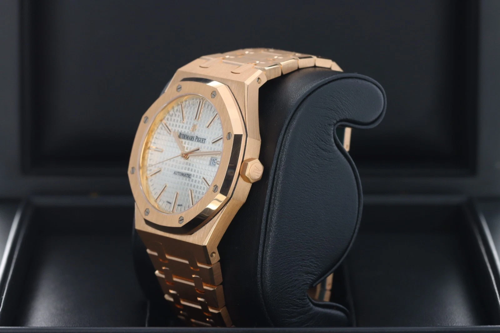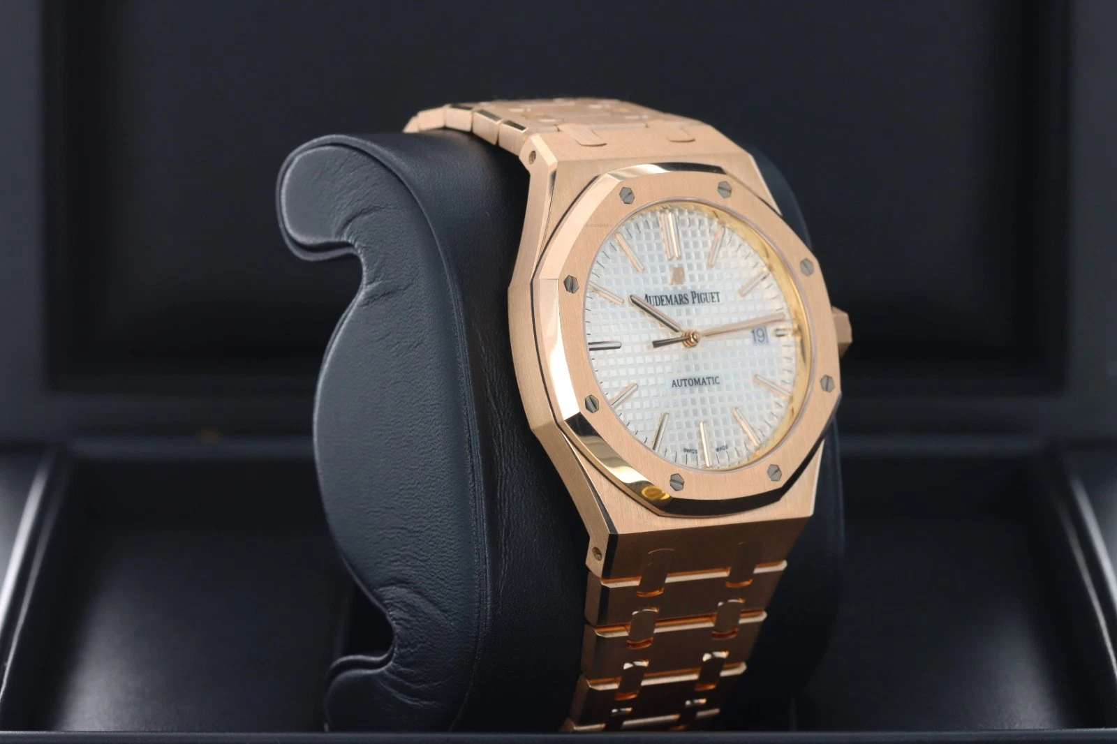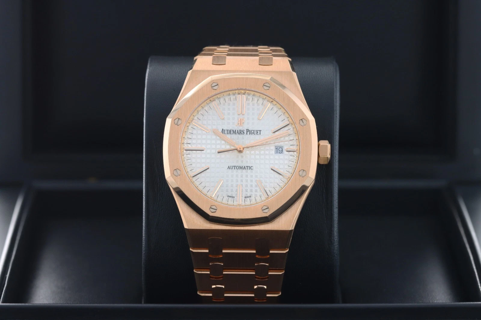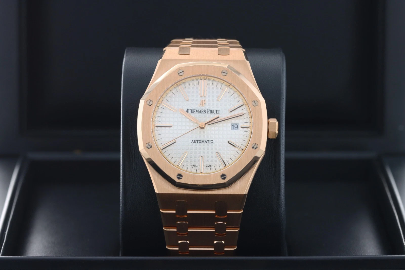 | Dial | Silver-toned dial with “Grande Tapisserie” pattern, rose gold applied hour-markers and Royal Oak hands with luminescent coating |