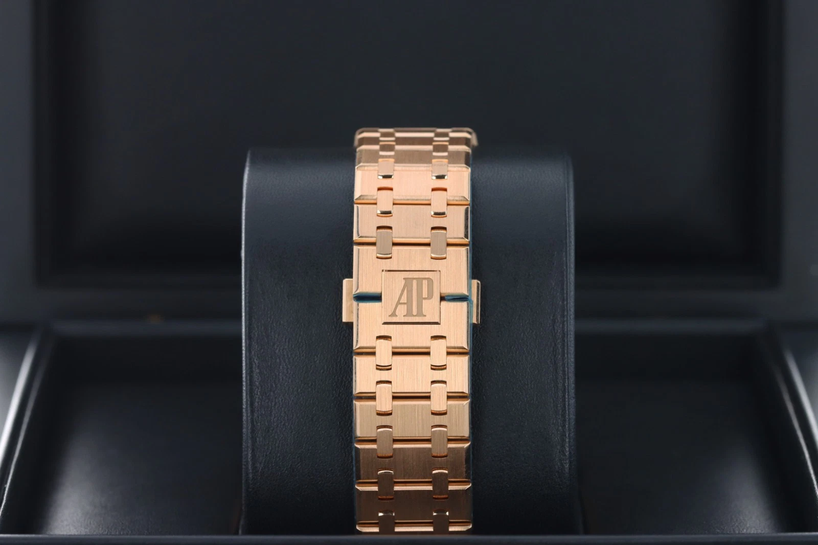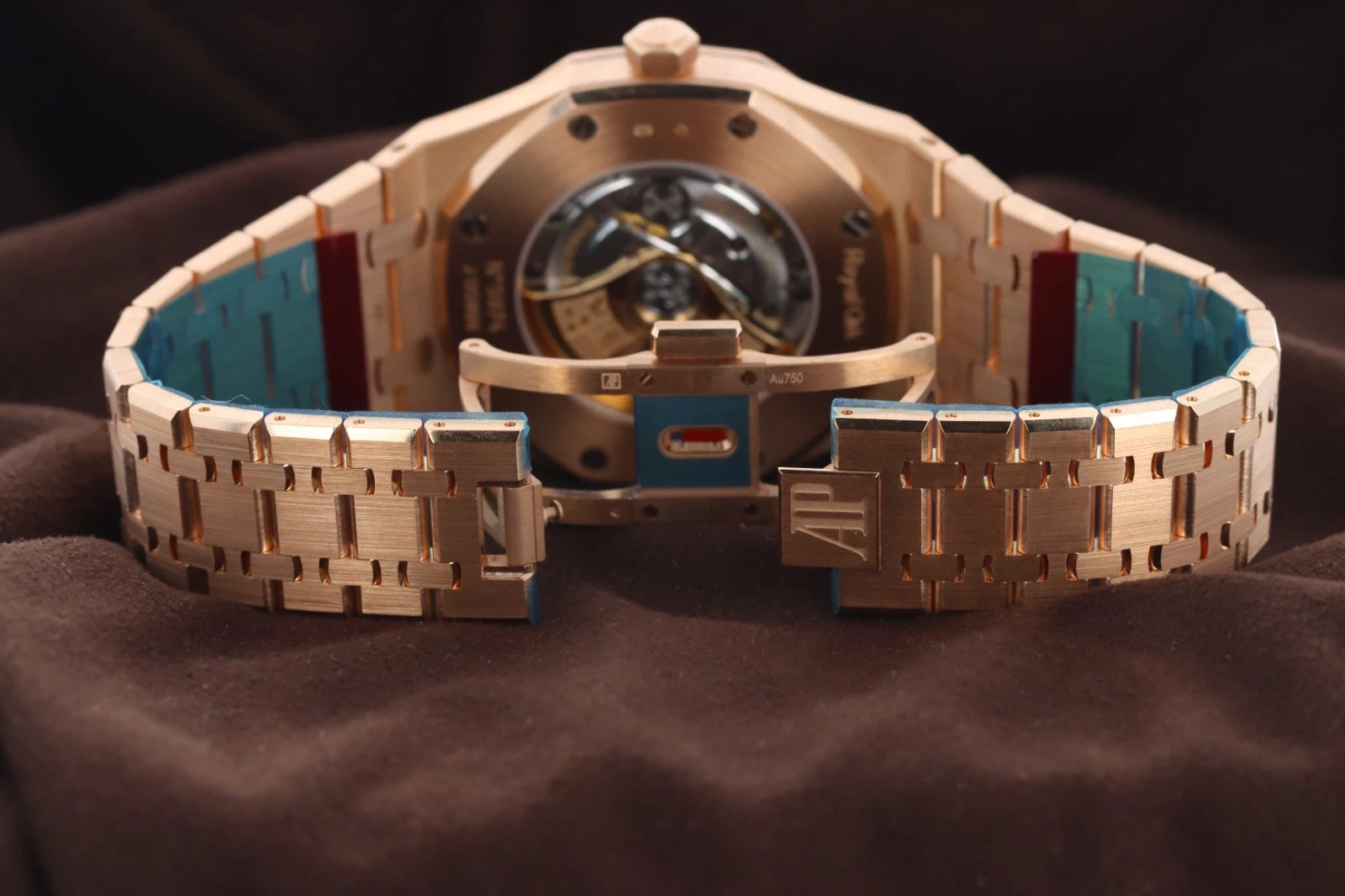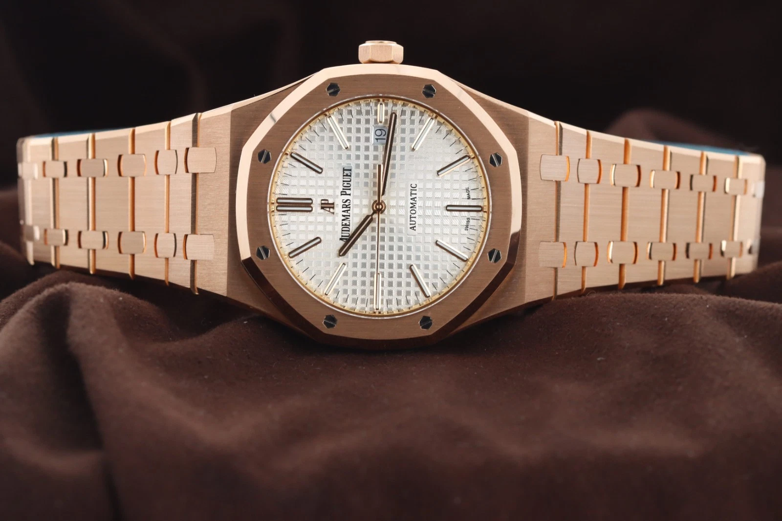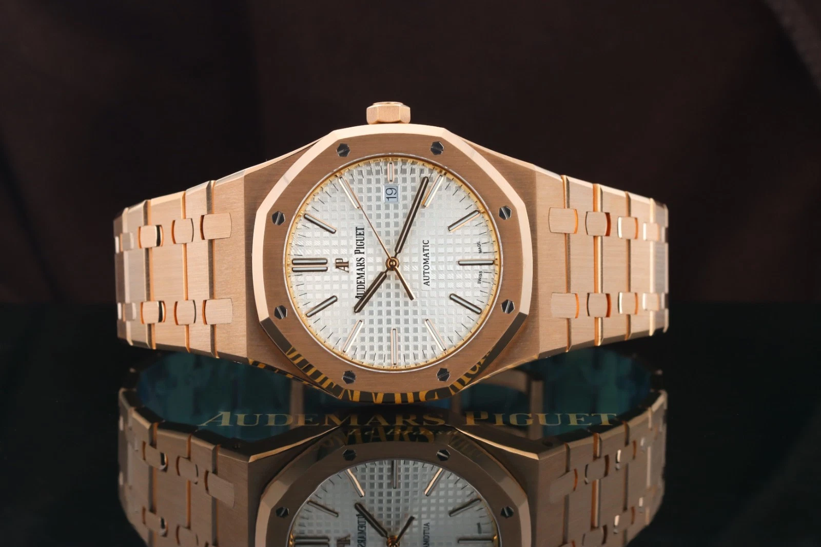 | Dial | Silver-toned dial with “Grande Tapisserie” pattern, rose gold applied hour-markers and Royal Oak hands with luminescent coating |