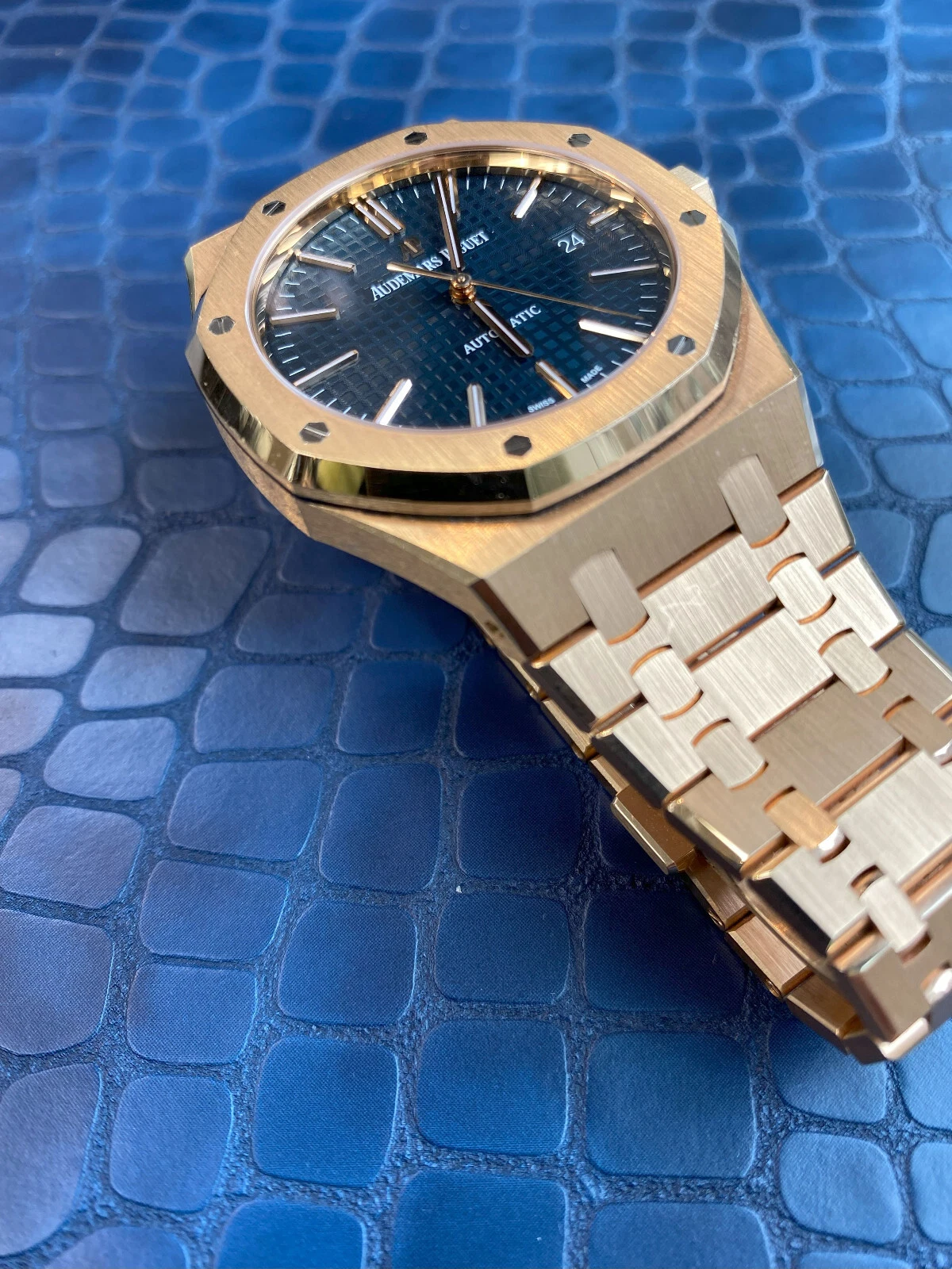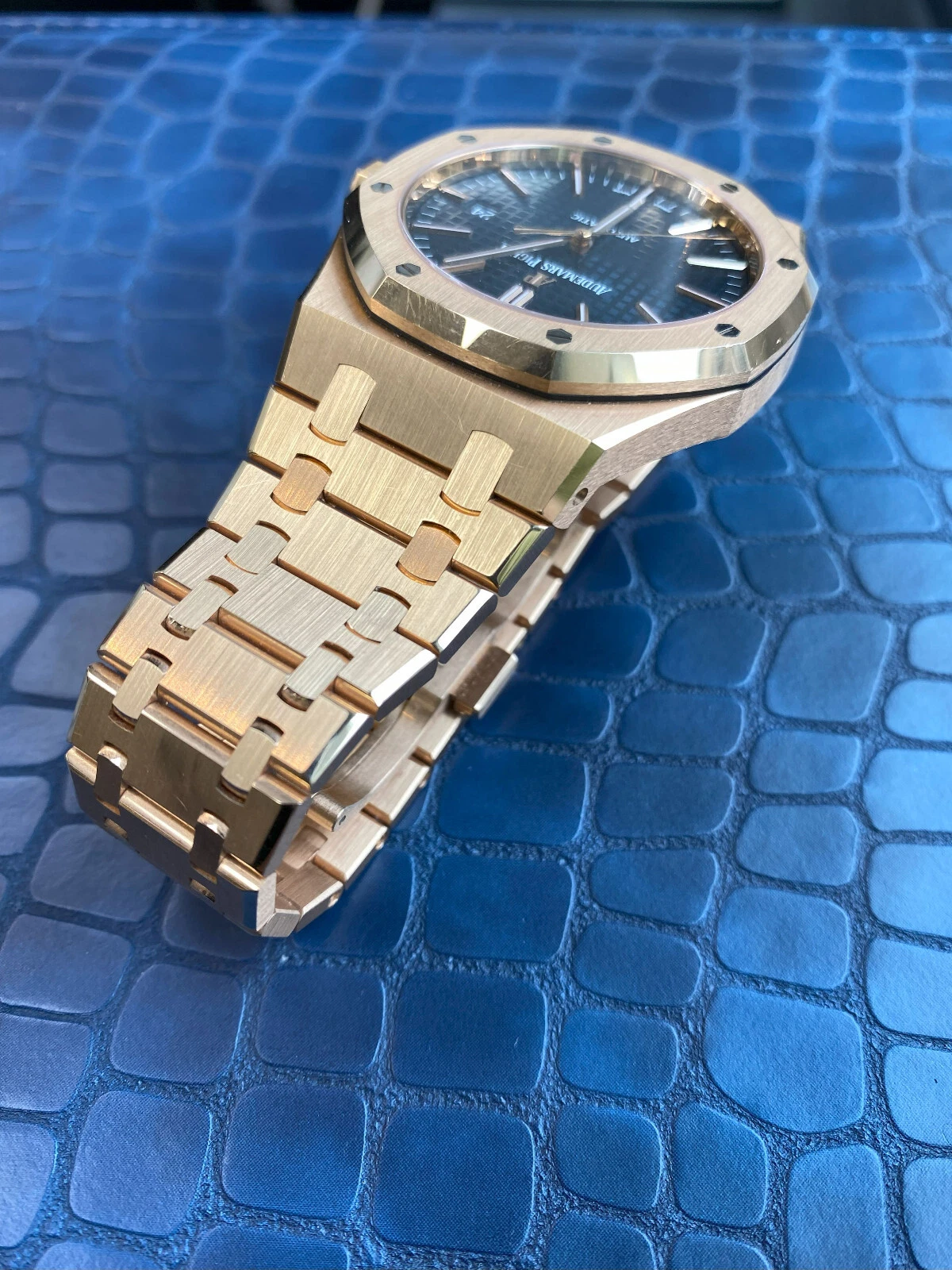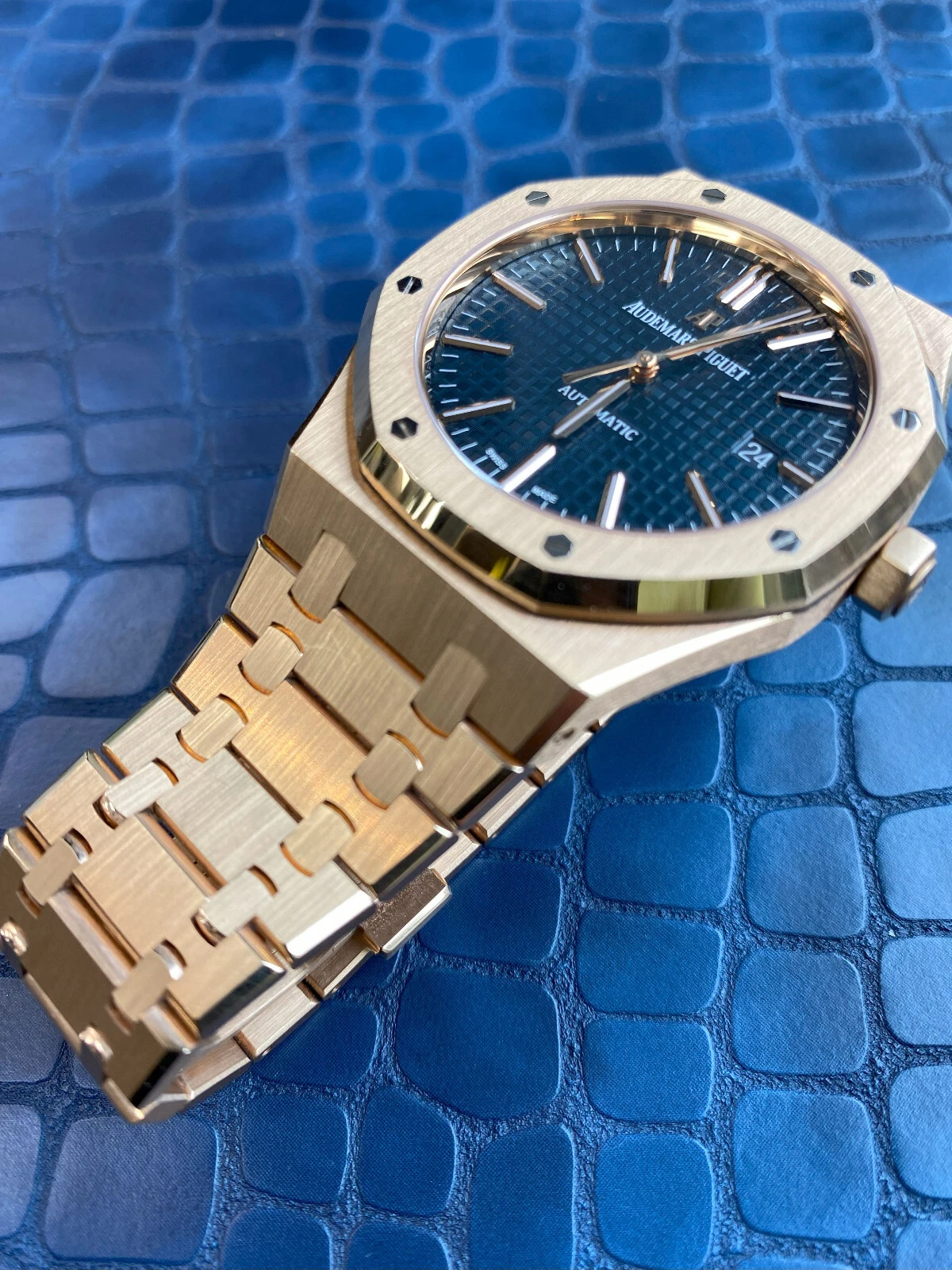 | Dial | Blue dial with “Grande Tapisserie” pattern, rose gold applied hour-markers and Royal Oak hands with luminescent coating |