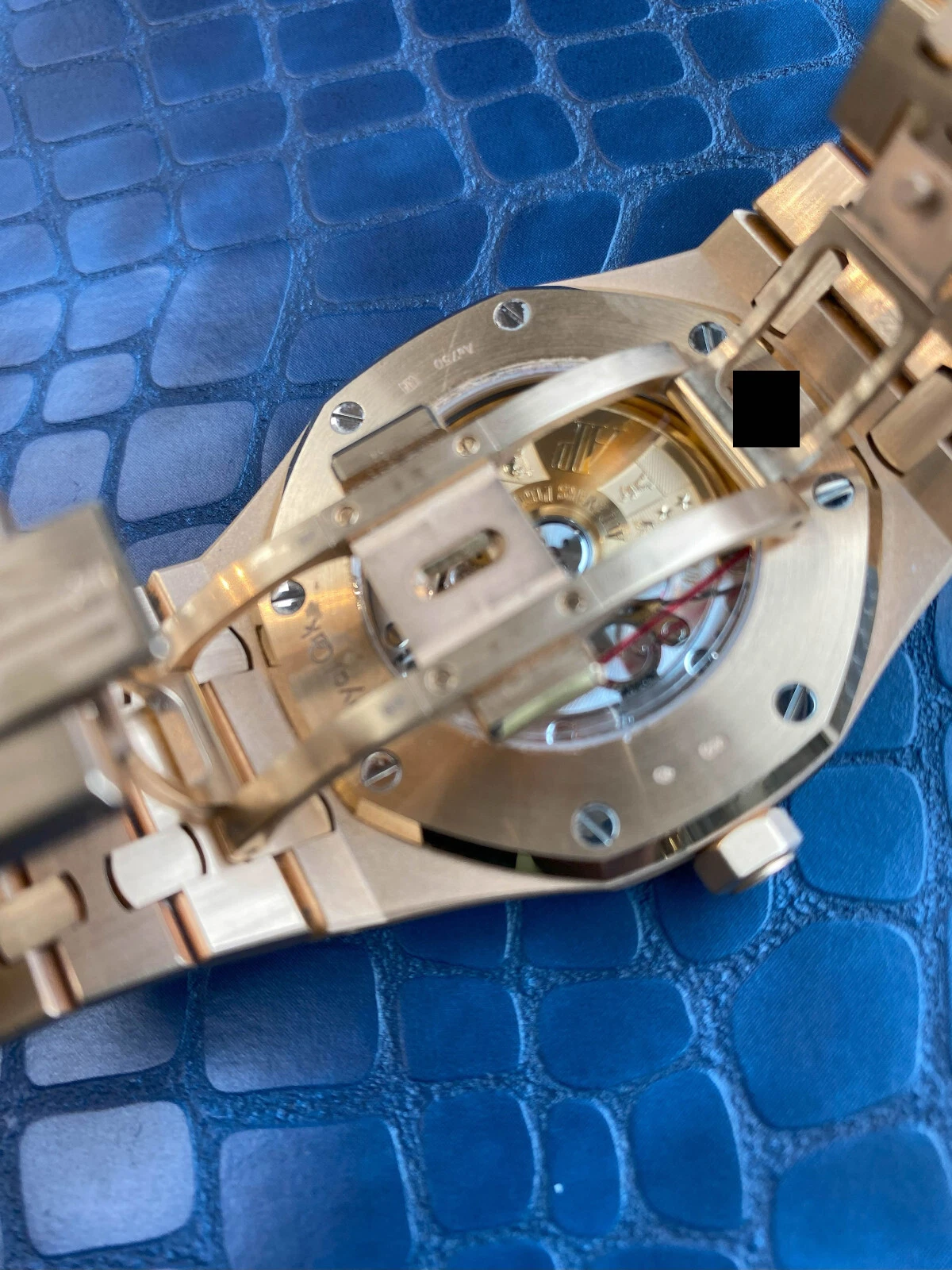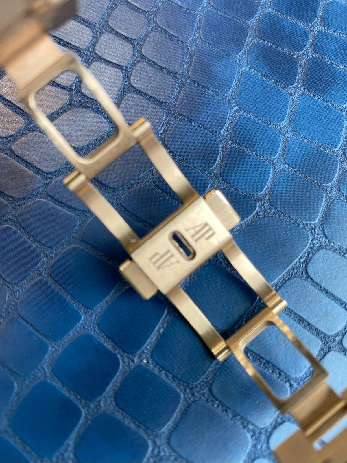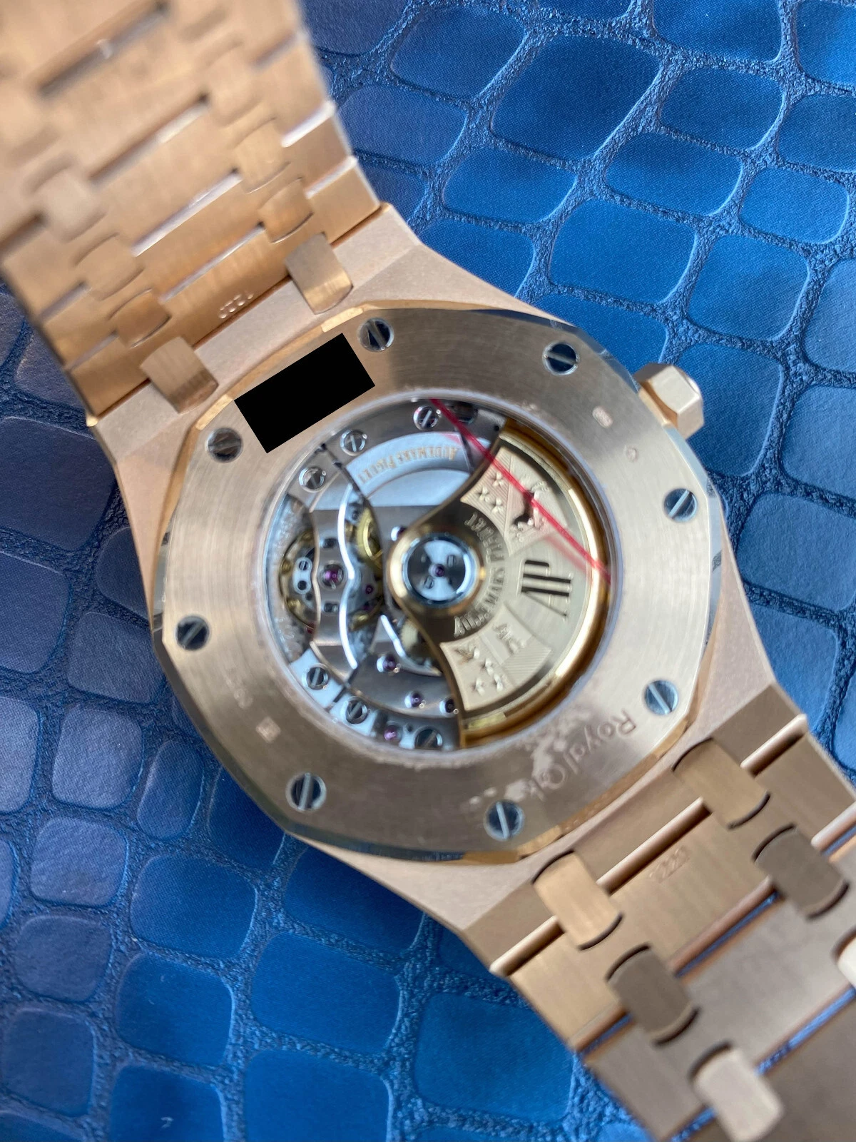| Dial | Blue dial with “Grande Tapisserie” pattern, rose gold applied hour-markers and Royal Oak hands with luminescent coating |