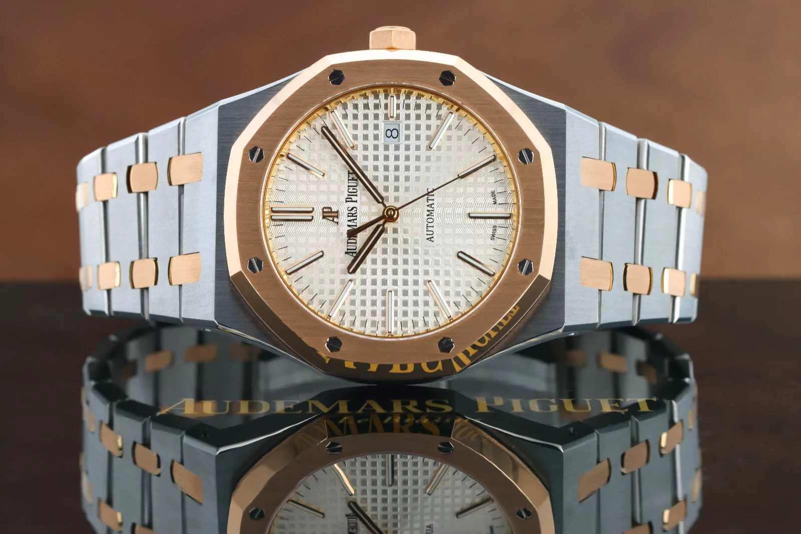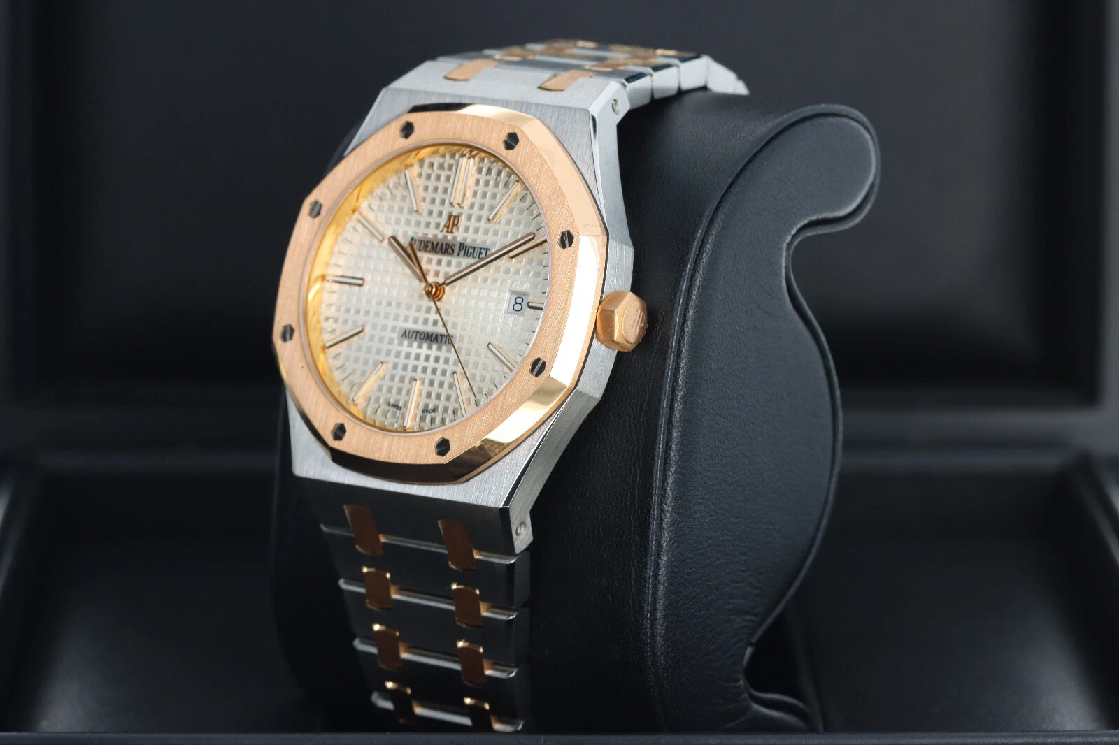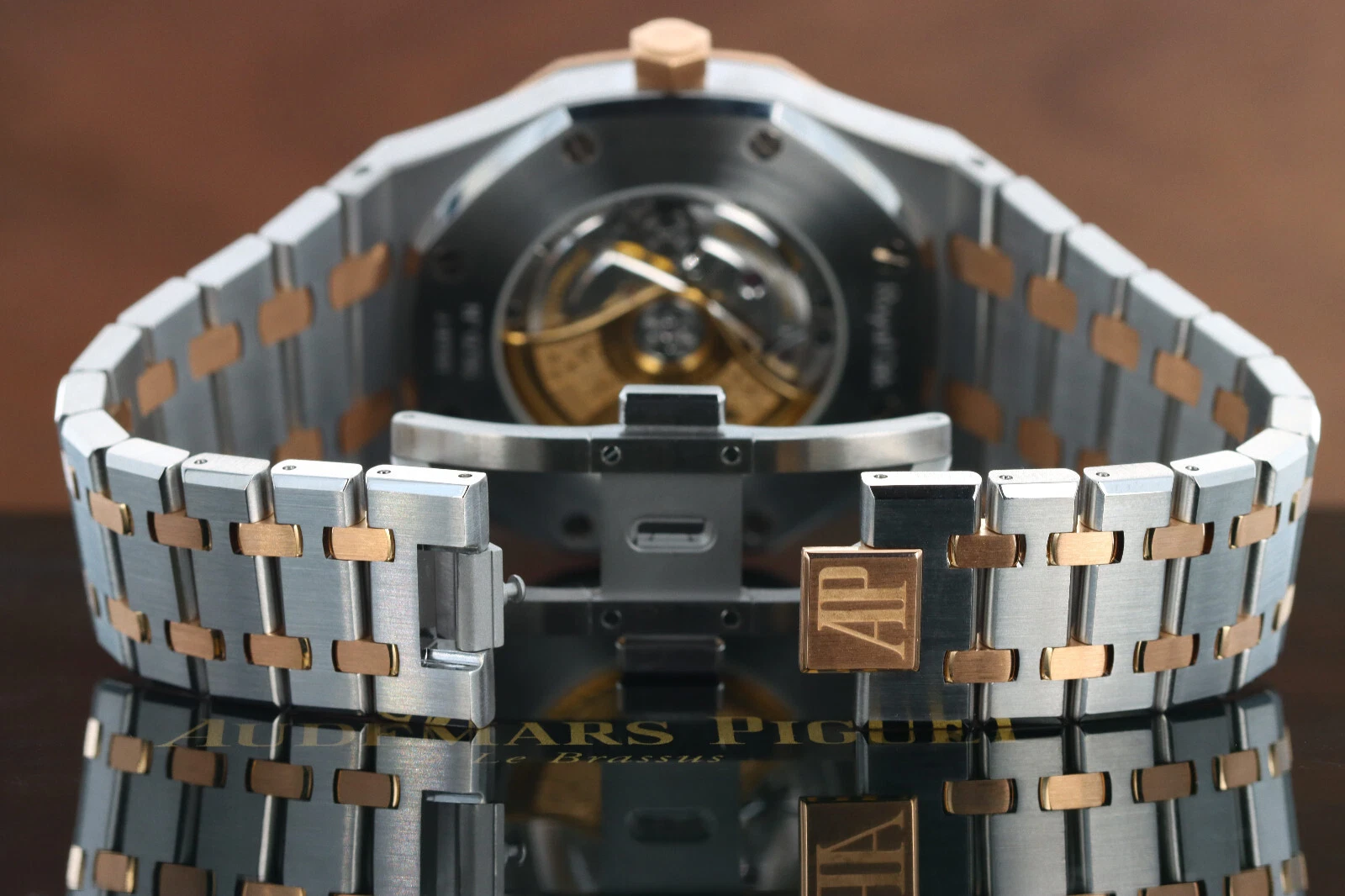 Dial Silver-toned dial with “Grande Tapisserie” pattern, pink gold applied hour-markers and Royal Oak hands with luminescent coating
