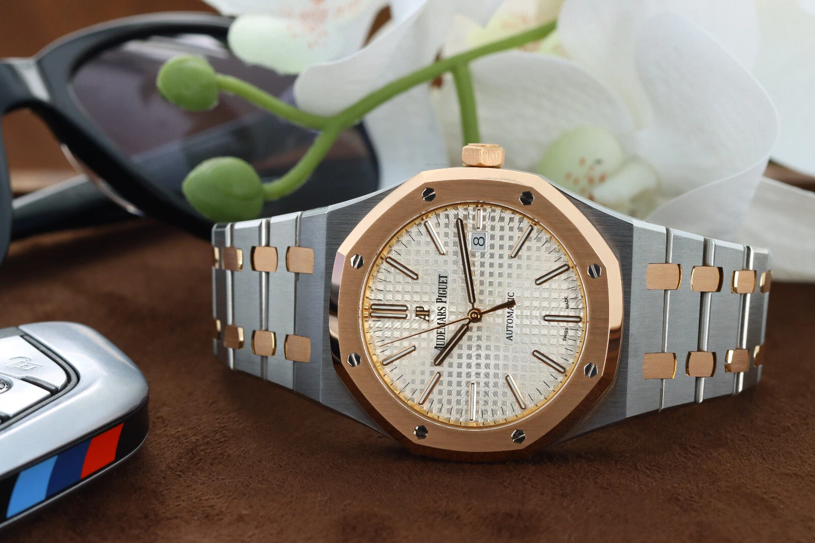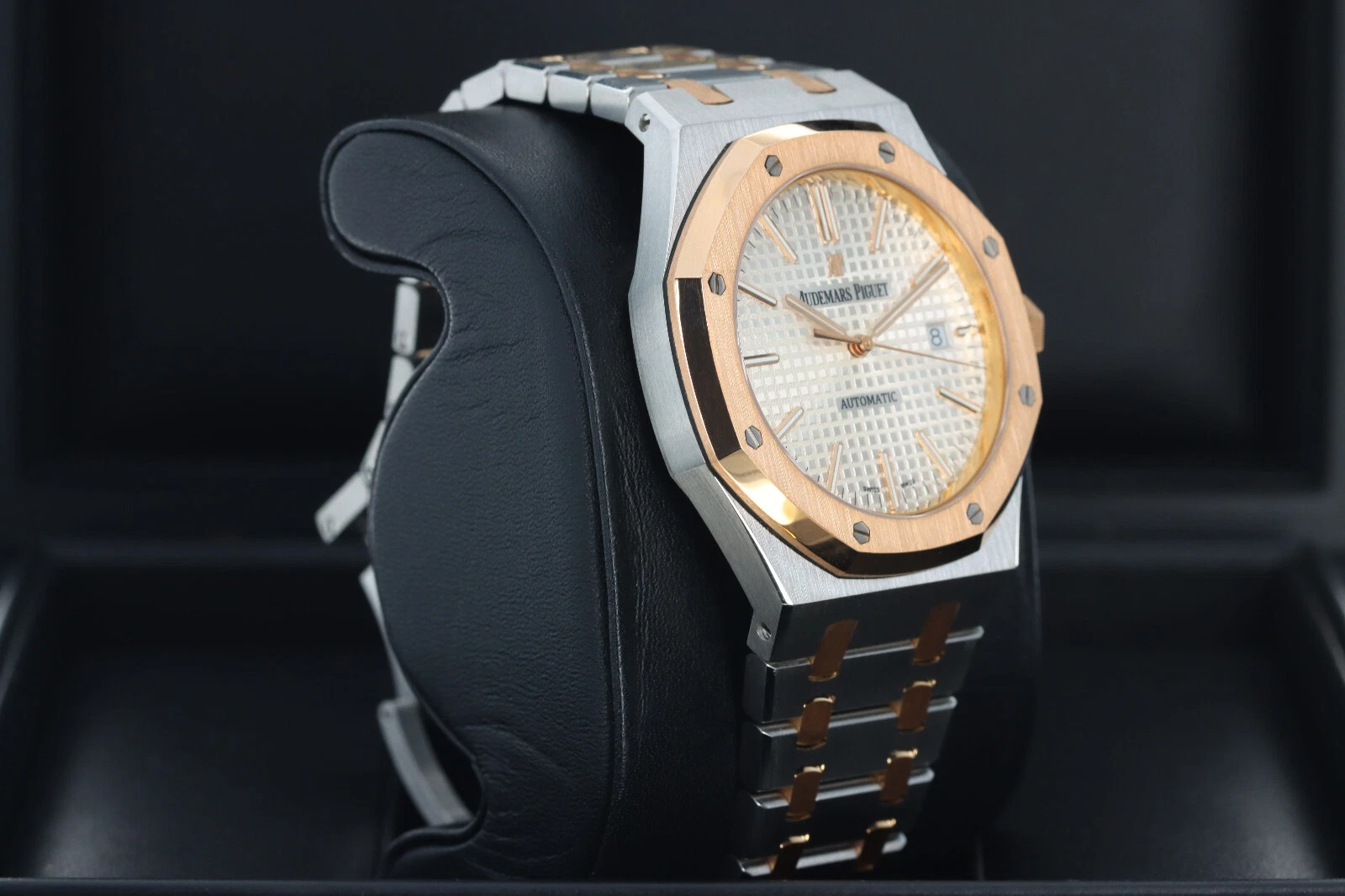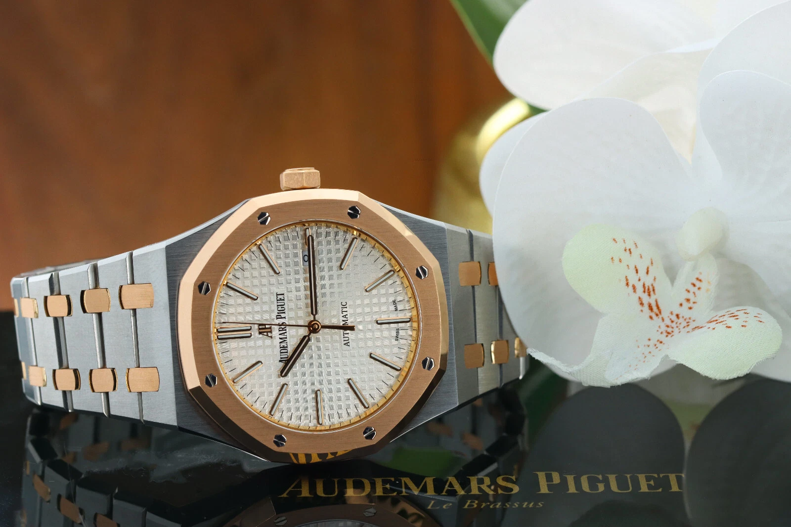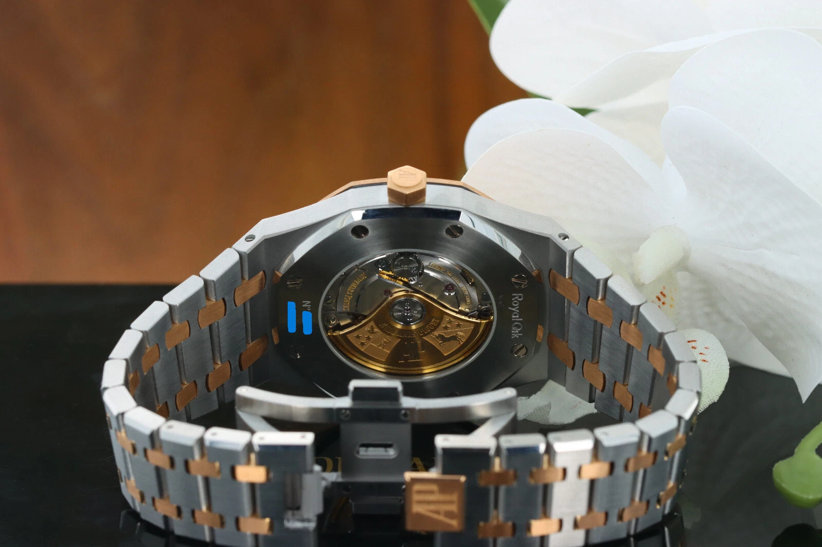 Dial Silver-toned dial with “Grande Tapisserie” pattern, pink gold applied hour-markers and Royal Oak hands with luminescent coating