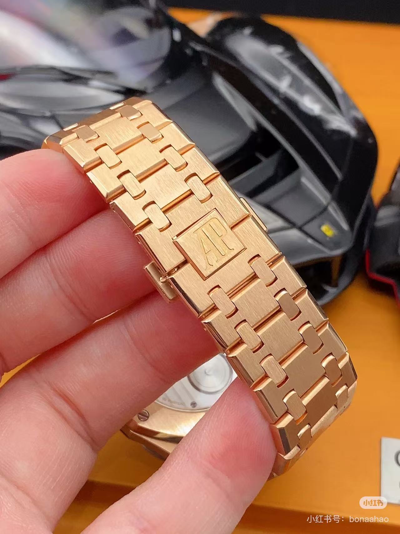 | Dial | Blue dial with “Petite Tapisserie” pattern, pink gold applied hour-markers and Royal Oak hands with luminescent coating. |