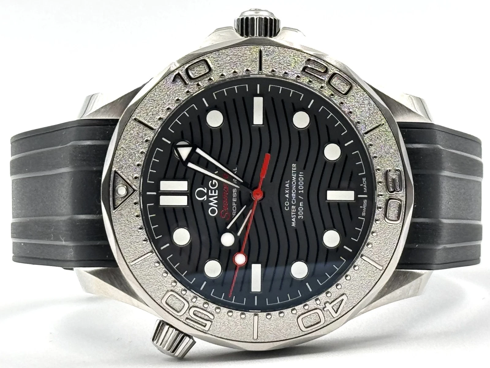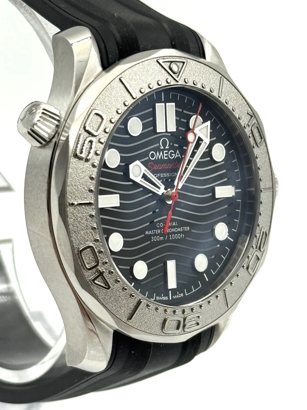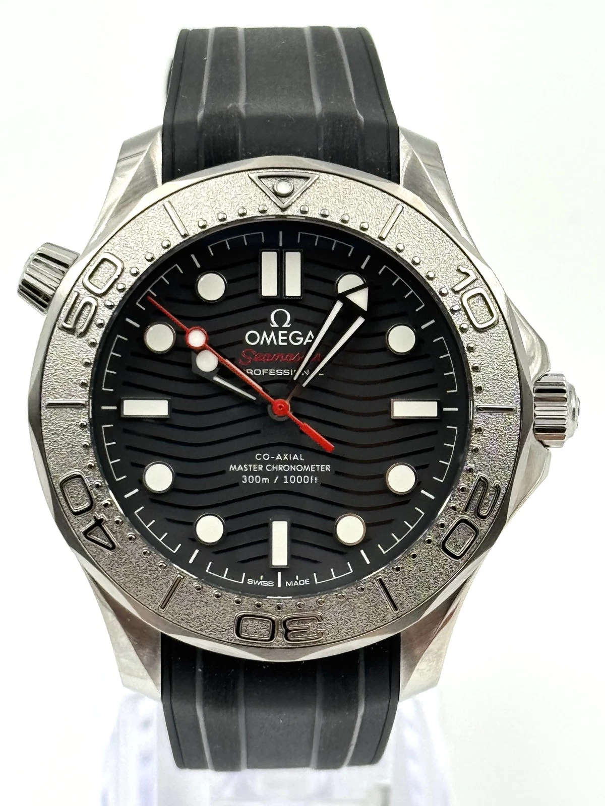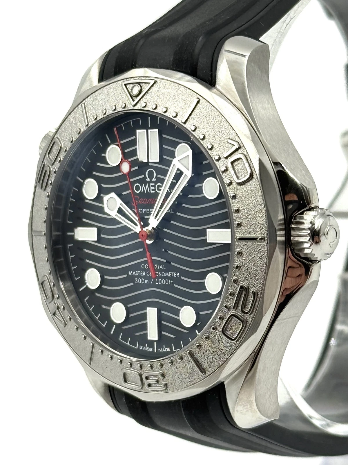Unworn Omega Seamaster DIVER 300M CO‑AXIAL MASTER CHRONOMETER 210.32.42.20.01.002. 42 mm, Black dial, Steel case, Ceramic bezel, 8806 calibre, Self Winding Movement, 55 hours power reserve, Rubber strap with Pin buckle clasp. Water resistant to 300 m.