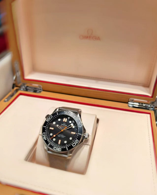 The OMEGA Seamaster Diver 300M blends iconic design with bold, modern updates, staying true to its legendary diving heritage since 1993. This 42mm stainless steel model stands out with a black oxalic anodized aluminum bezel, featuring a white Super-LumiNova diving scale for easy readability. The matching black aluminum dial is enhanced with rhodium-plated, skeletonized hands and indexes, filled with Super-LumiNova for a radiant blue glow in the dark. Accents of vibrant orange on the central seconds hand, quarter-hour markers, and the Seamaster name bring a dynamic edge to this sleek design.