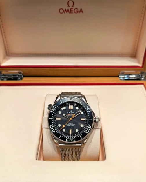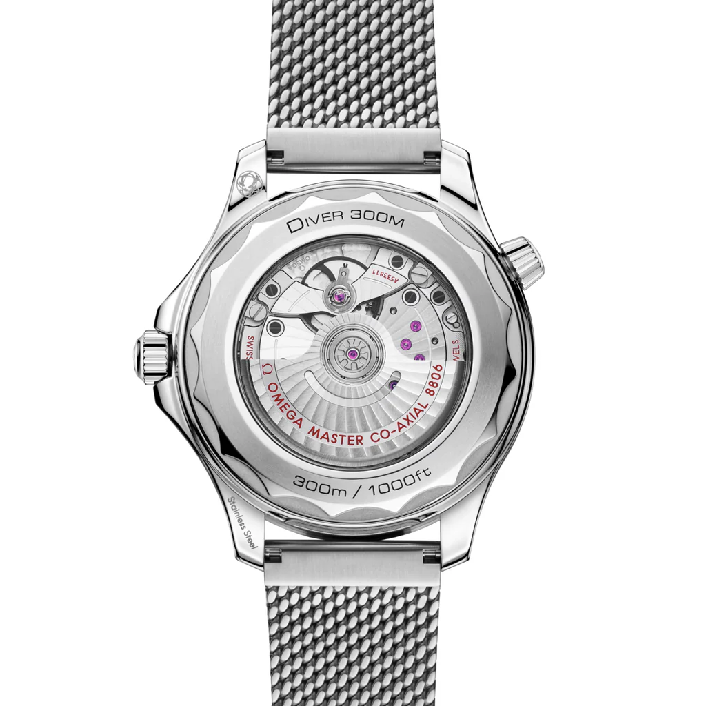 Presented on a brushed mesh bracelet with a secure clasp, the watch offers both durability and comfort. Inside, the Co-Axial Master Chronometer Caliber 8806 drives the timepiece with exceptional precision and a 55-hour power reserve. Certified by METAS, this movement ensures superior anti-magnetism, shock resistance, and long-lasting reliability. The sapphire crystal caseback reveals the beautifully finished movement beneath.