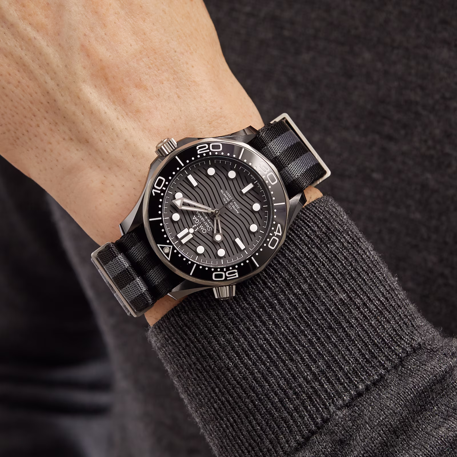 The Omega Seamaster Diver 300M Black Dial Men's Watch 210.92.44.20.01.002 is a professional and scientifically designed timepiece for diving enthusiasts. This masterpiece features a black ceramic case with a grade 5 titanium finish and a black and grey 5-stripe NATO strap. Its black ceramic unidirectional rotating bezel boasts a white enamel diving scale, while the black ceramic dial with wave pattern showcases luminescent hands, dots, and index hour markers. With its anti-magnetic feature that resists magnetic fields greater than 1.5 tesla (15,000 gauss), this watch is truly a technological wonder. The inclusion of a helium escape valve on the edge of the case at 10 o'clock adds to its functionality.