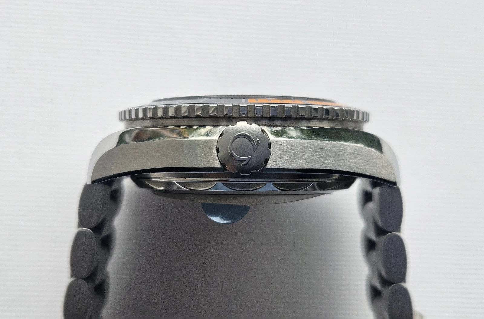 This model, with its scratch-resistant sapphire crystal, features a polished black ceramic dial with with Arabic numerals and a date window at the 3 o’clock position. Mounted on the 43.5 mm stainless steel case, is the world's premiere black ceramic bezel with orange rubber. The diving scale of the bezel is crafted with Liquidmetal™.