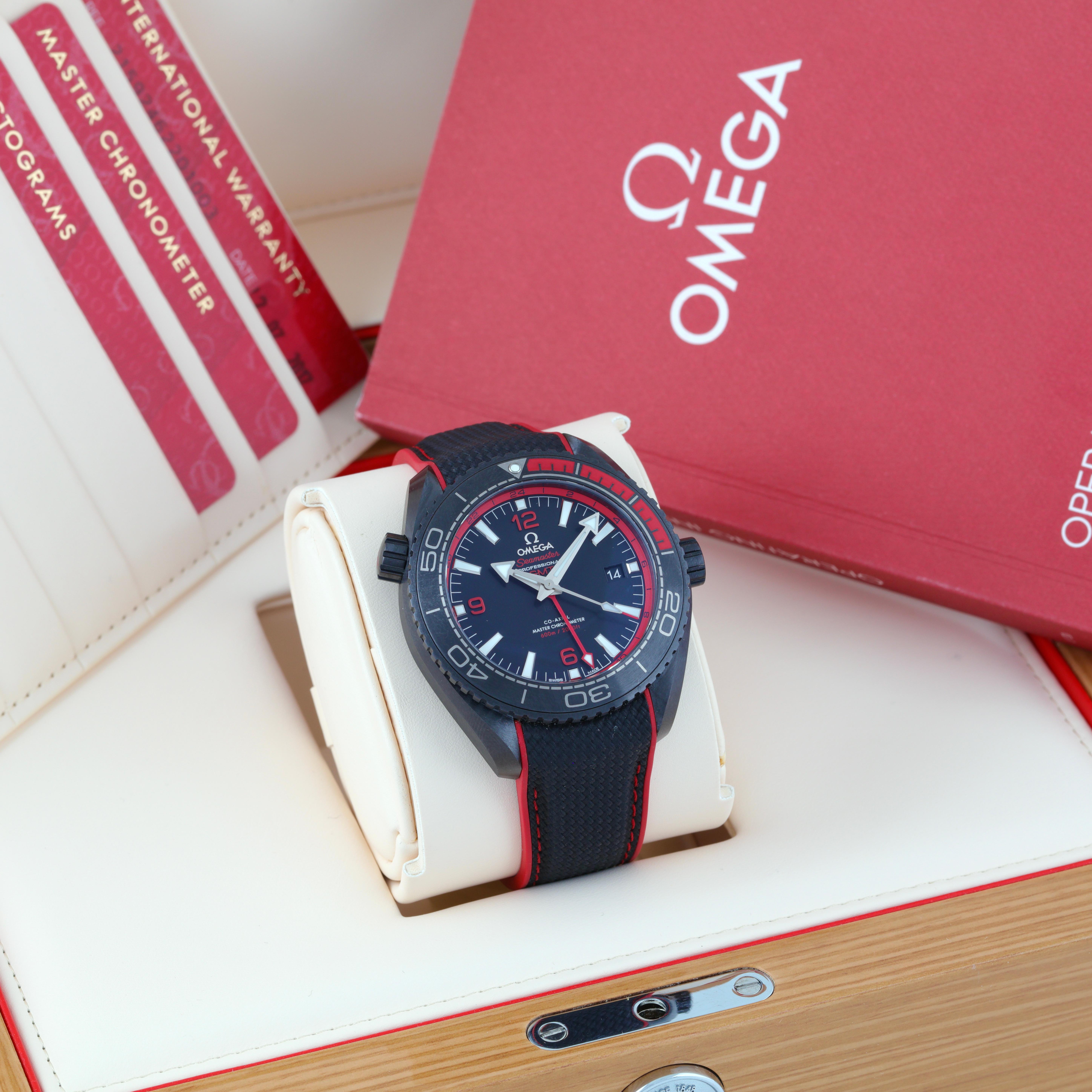 Omega Seamaster PLANET OCEAN 600M CO‑AXIAL MASTER CHRONOMETER GMT 215.92.46.22.01.003. 45.5 mm, Black dial, Black ceramic case, Ceramic bezel, 8906 calibre, Self Winding Movement, 60 hours power reserve, Rubber strap with Foldover clasp. Water resistant to 600 m.