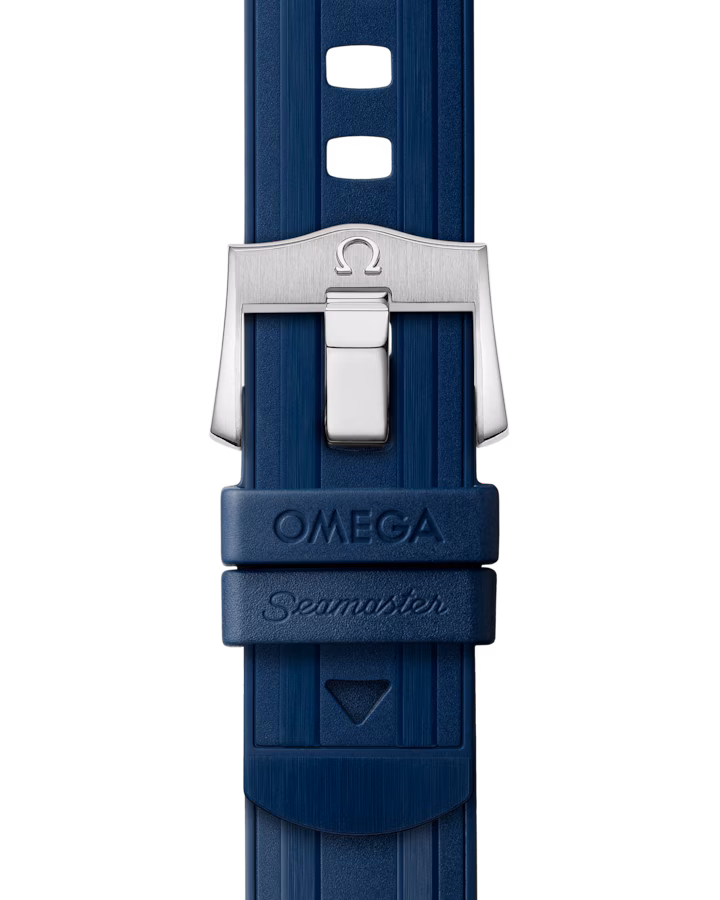 Since 1993, the Seamaster Professional Diver 300M has enjoyed a legendary following. Today’s modern collection has embraced that famous ocean heritage and updated it with OMEGA’s best innovation and design.This 44 mm chronograph model is crafted from stainless steel and 18K yellow gold, and includes a polished blue ceramic bezel with a Ceragold™ diving scale. The pushers are also polished blue ceramic, as well as the dial which features laser-engraved waves and a date window at 6 o’clock.The subdial hands are 18K yellow gold, along with all other hands and indexes which are filled with white Super-LumiNova.The watch is presented on a blue rubber strap and is driven by the OMEGA Master Chronometer Calibre 9900, which can be seen through the sapphire-crystal on the wave-edged caseback.