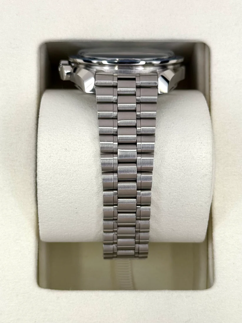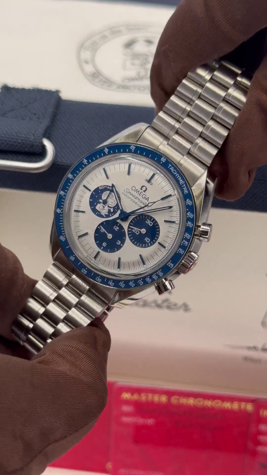 • Instead of the Moonwatch’s utilitarian black dial, this reference has a vibrant silver finish with blue sub-registers and a matching blue tachymeter scale