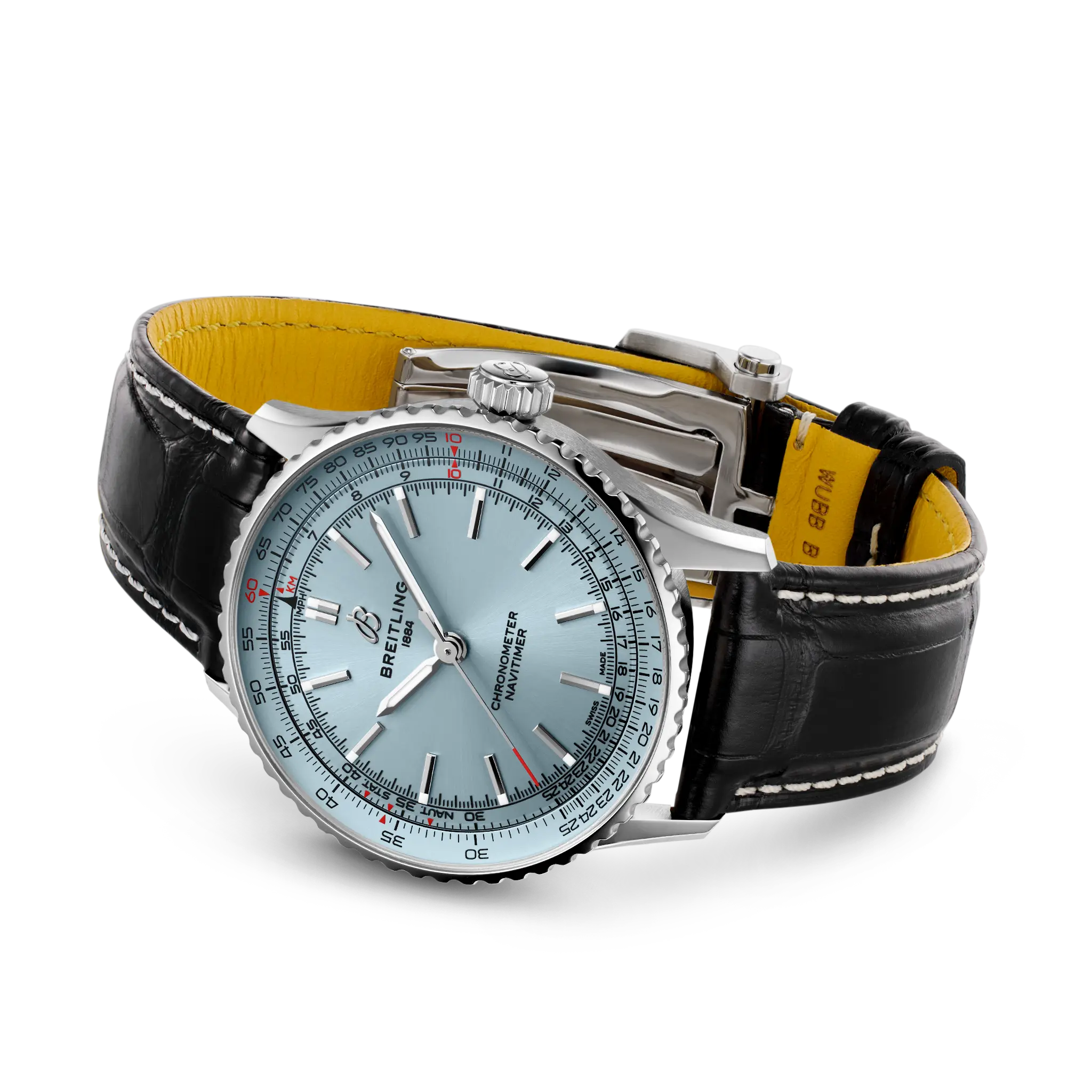 Experience the timeless elegance of the Breitling Navitimer Automatic 41 A17329171C1P1. This stunning timepiece features a striking blue dial with index hour markers, exuding a sense of sophistication and style. The 41mm stainless steel case houses a slide rule bezel, adding both functionality and flair to the design. Paired with a luxurious black leather strap and a convenient folding clasp, this automatic chronometer watch is the perfect accessory for any occasion. Elevate your look with the impeccable craftsmanship and precision of Breitling.