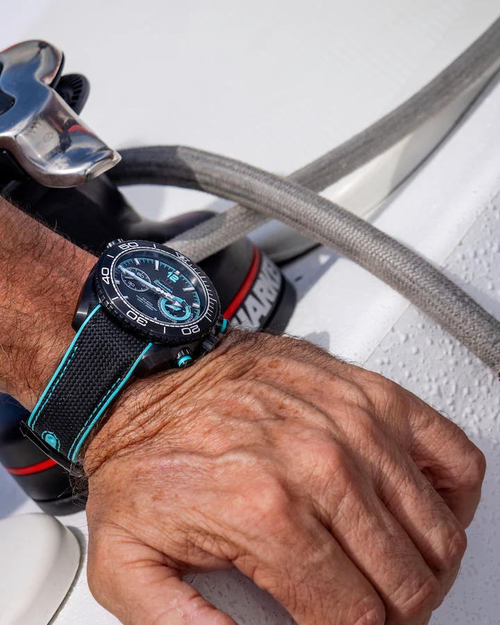On the matte black ceramic dial, a countdown indicator at 3 o’clock is colored in the iconic turquoise to signal pre-race timing, while the minute track, number 12, and chronograph hand are accented in the same shade. OMEGA includes this vibrant color on the rings of the ceramic pushers, helium escape valve, and crown logo. The NAIAD LOCK caseback showcases the Emirates Team New Zealand logo with a turquoise fern, while a black and turquoise rubber strap with a ceramic clasp secures the watch comfortably.