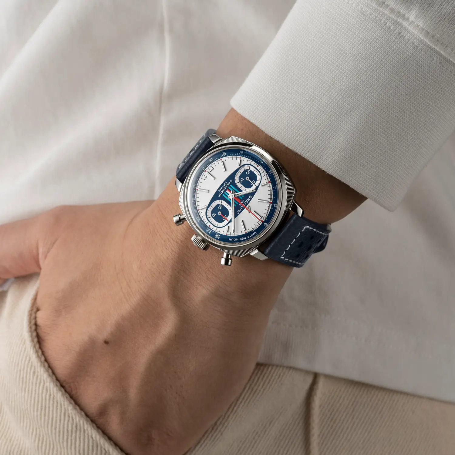 Introduced in the transformative 1960s, Willy Breitling’s unconventional line of racing-inspired chronographs captured the era’s freewheeling vibe. Today, the new Top Time collection channels that adrenaline-fueled energy, blending modern-retro design with cutting-edge performance. Instantly recognizable, the Top Time Martini Racing takes its cues from one of the most celebrated liveries of all time. Its dial is dominated by Martini Racing’s signature light blue, dark blue, and red stripes. It features a modern-retro take on the cushion case, squircle subdials, and the unmistakable surfboard dial design. Sized at a sleek 38 mm, it’s paired with a perforated dark blue calfskin leather strap secured by a folding clasp. Beating inside the watch is the Breitling’s flagship Manufacture Caliber 01—a COSC-certified chronometer built for precision under pressure and featuring a 70-hour power reserve. Limited to 750 pieces, The Top Time Martini Racing blends retro aesthetics with modern comfort.